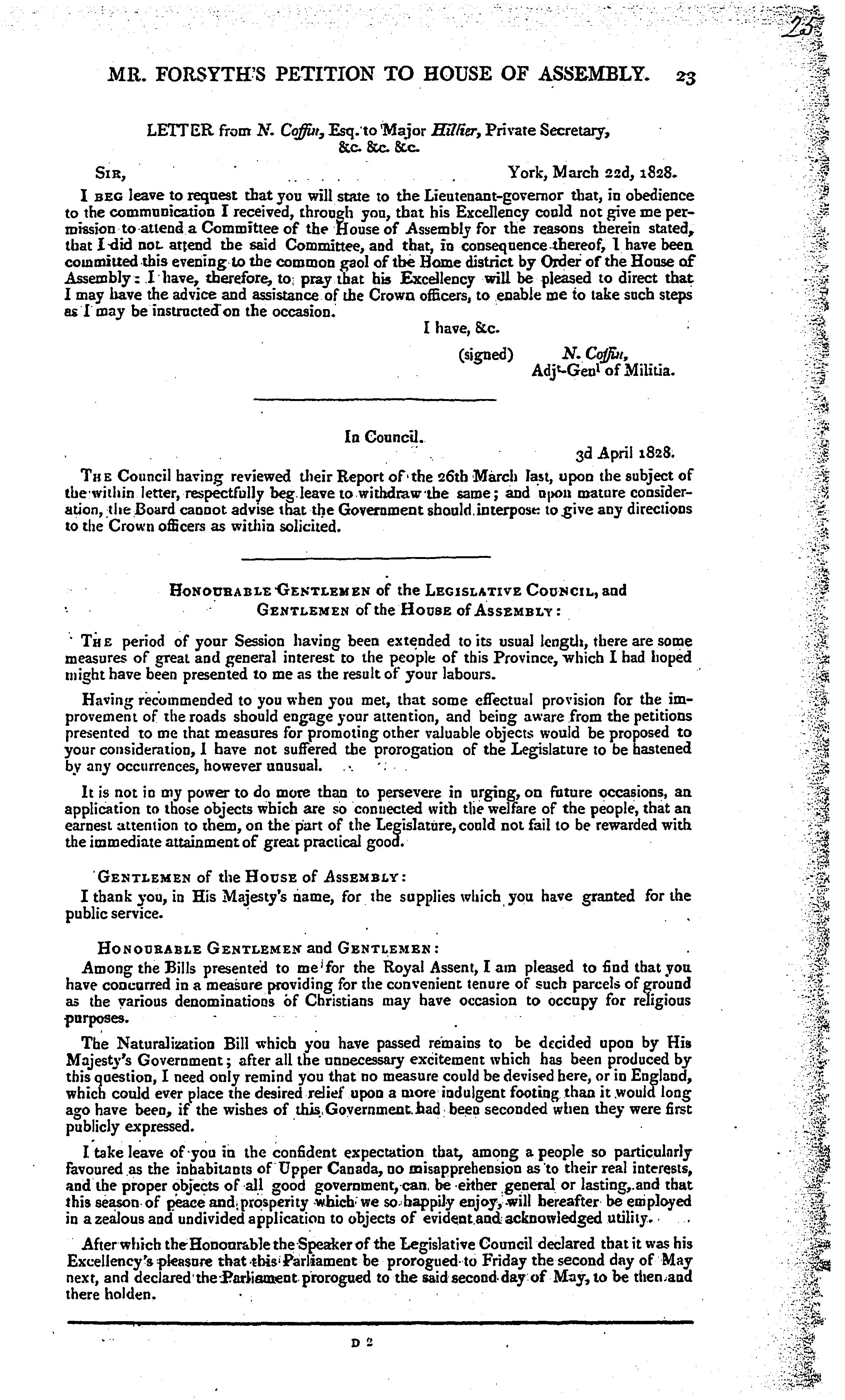 Running title: Canada : correspondence relative to Mr. Forsyth's petition to House of Assembly.