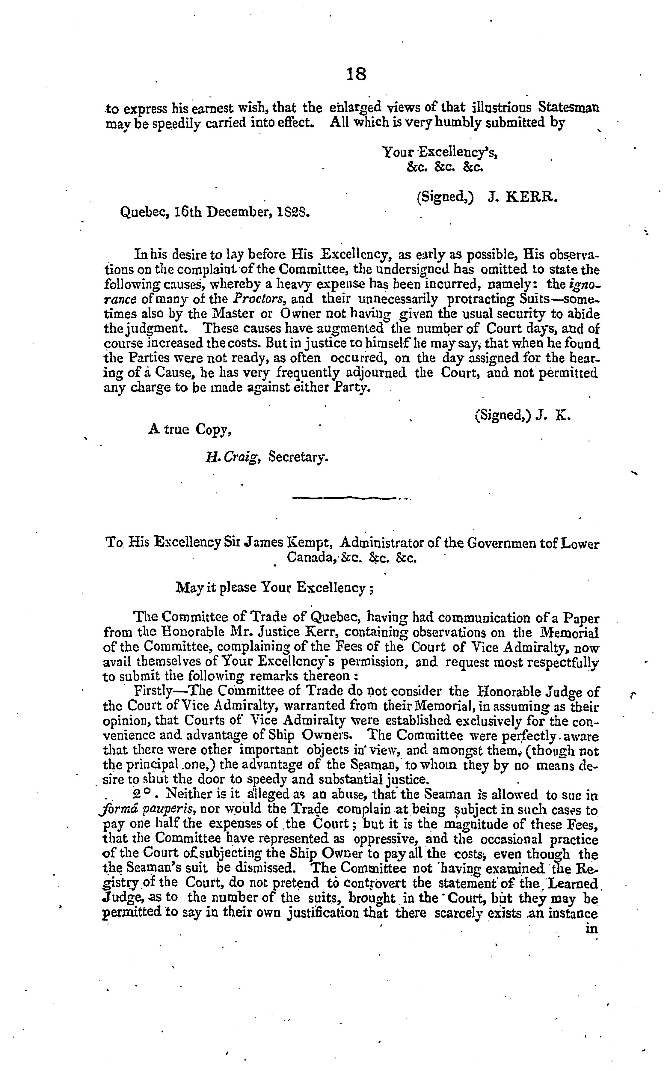 Message : Aylmer, Governor in Chief, In compliance with the request contained in the address of the House of Assembly of the 25th November, the Governor in Chief transmits copies of the correspondence required respecting the Honble. James Kerr, Esquire, judge of the Court of Vice- Admiralty ...