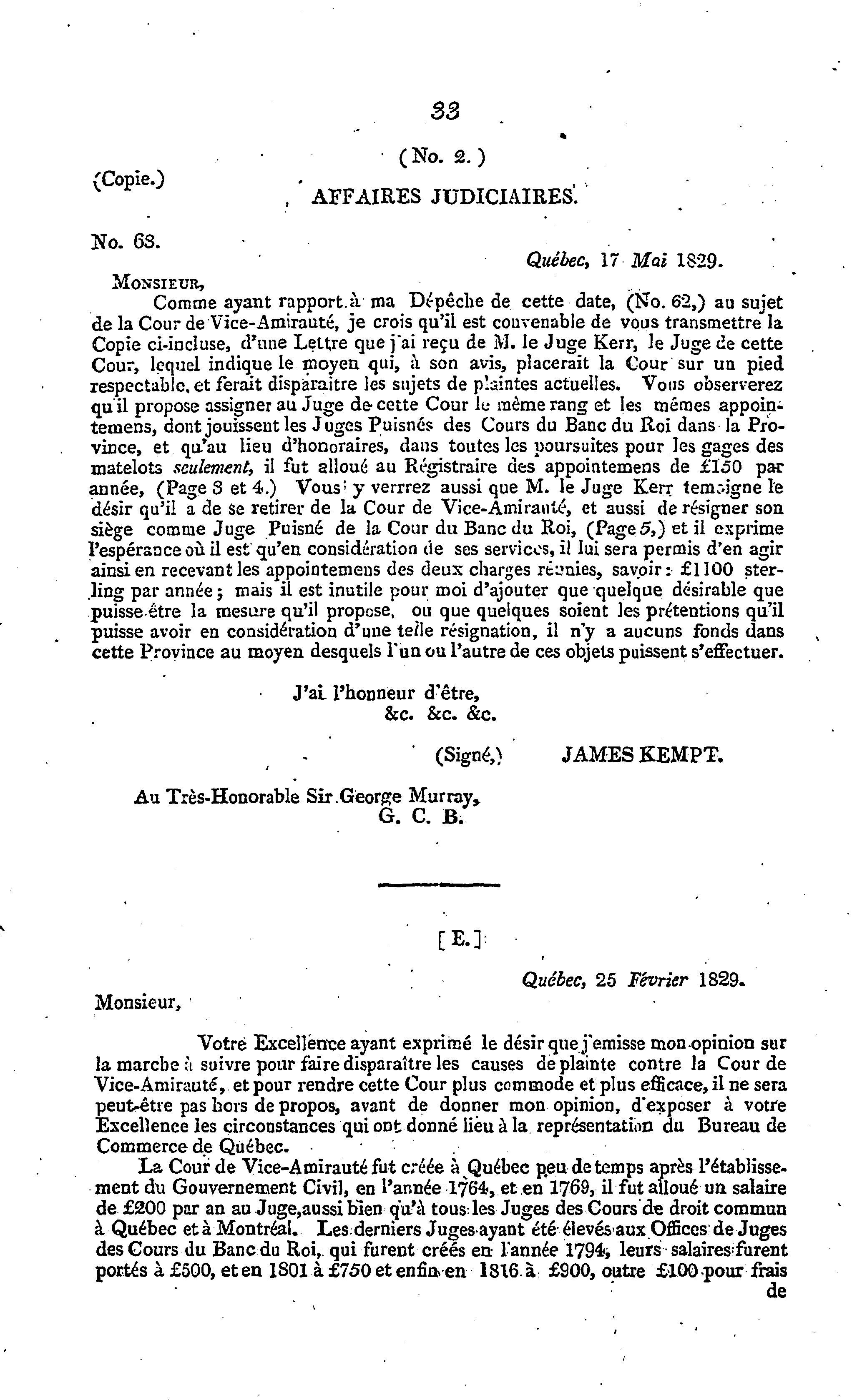 Half-title: Message : Aylmer, Governor in Chief, In compliance with the request of the House of Assembly of the 25th November, the Governor in Chief transmits copies of the correspondence required regardings the Honble. James Kerr, judge of the Court of Vice-Admiralty ... = Message : Aylmer, Gouverneur en Chef, Conformément à la demande contenue dans l'adresse de la Chambre d'assemblée du 25 novembre, le Gouverneur en Chef transmet des copies de la correspondance demandée touchant l'Honble. James Kerr ..., juge de la Cour de vice-amirauté ...