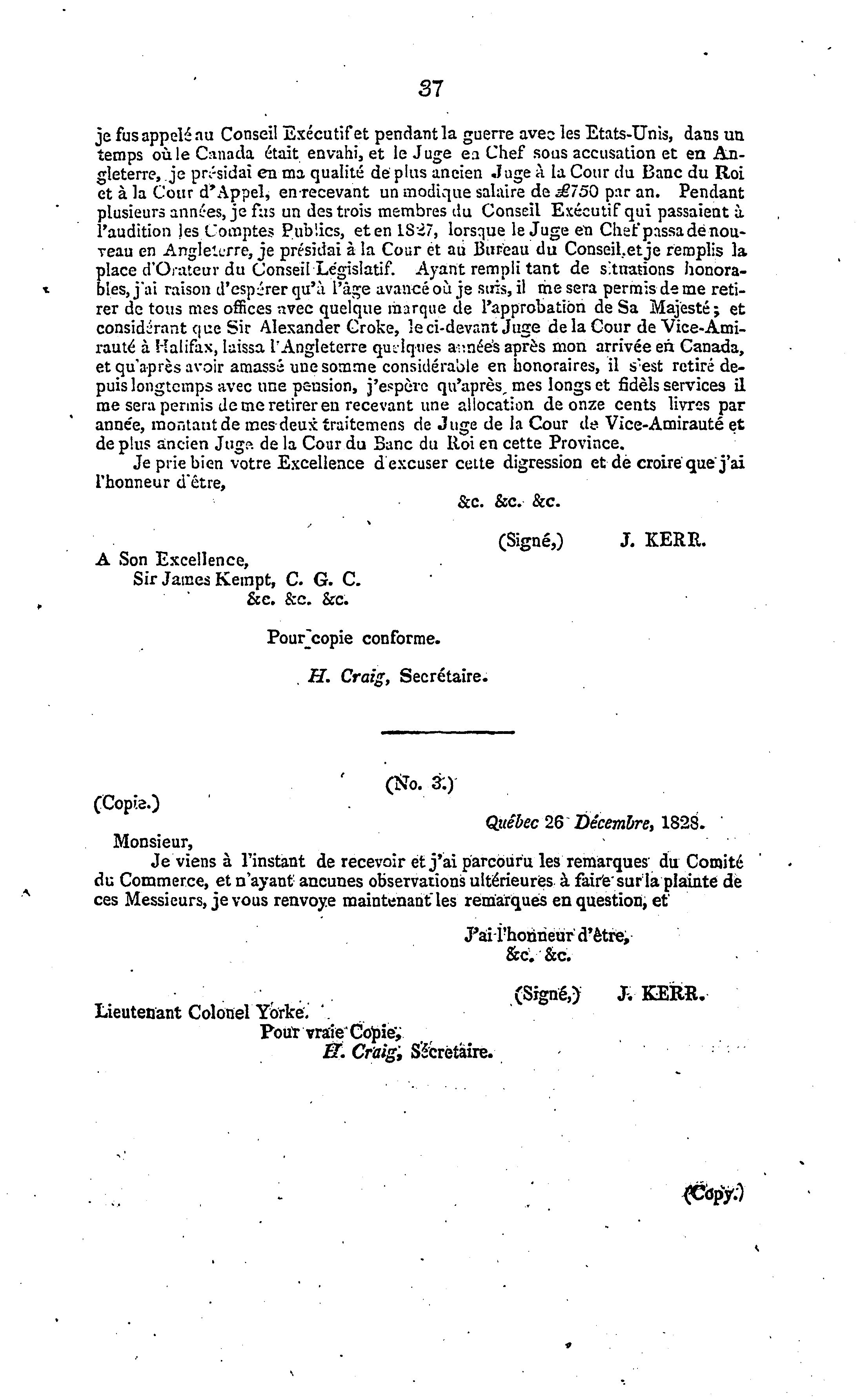 Message : Aylmer, Gouverneur en Chef, Conformément à la demande contenue dans l'adresse de la Chambre d'assemblée du 25 novembre, le Gouverneur en Chef transmet des copies de la correspondance demandée touchant l'Honble. James Kerr ..., juge de la Cour de vice-amirauté ...