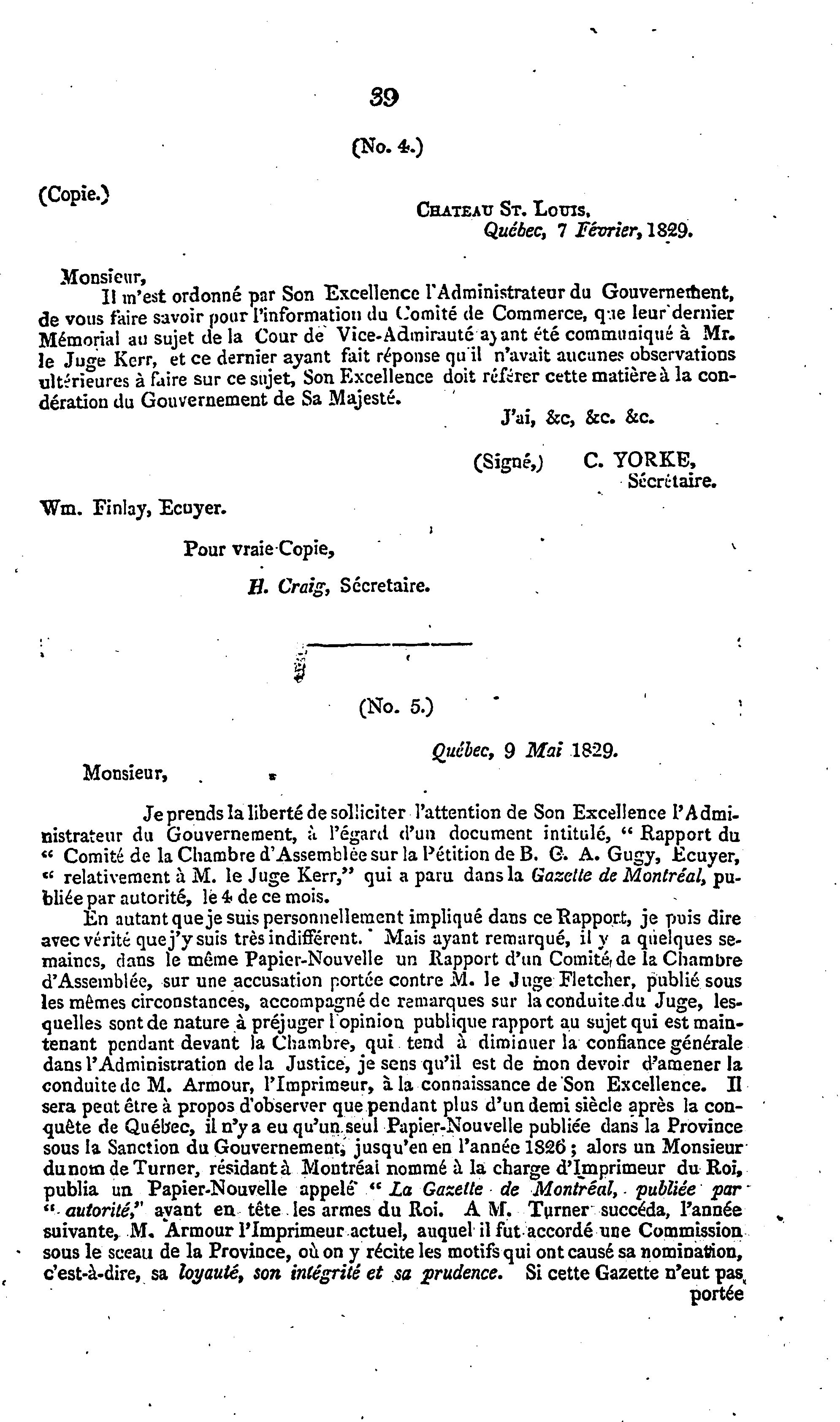 Message : Aylmer, Gouverneur en Chef, Conformément à la demande contenue dans l'adresse de la Chambre d'assemblée du 25 novembre, le Gouverneur en Chef transmet des copies de la correspondance demandée touchant l'Honble. James Kerr ..., juge de la Cour de vice-amirauté ...