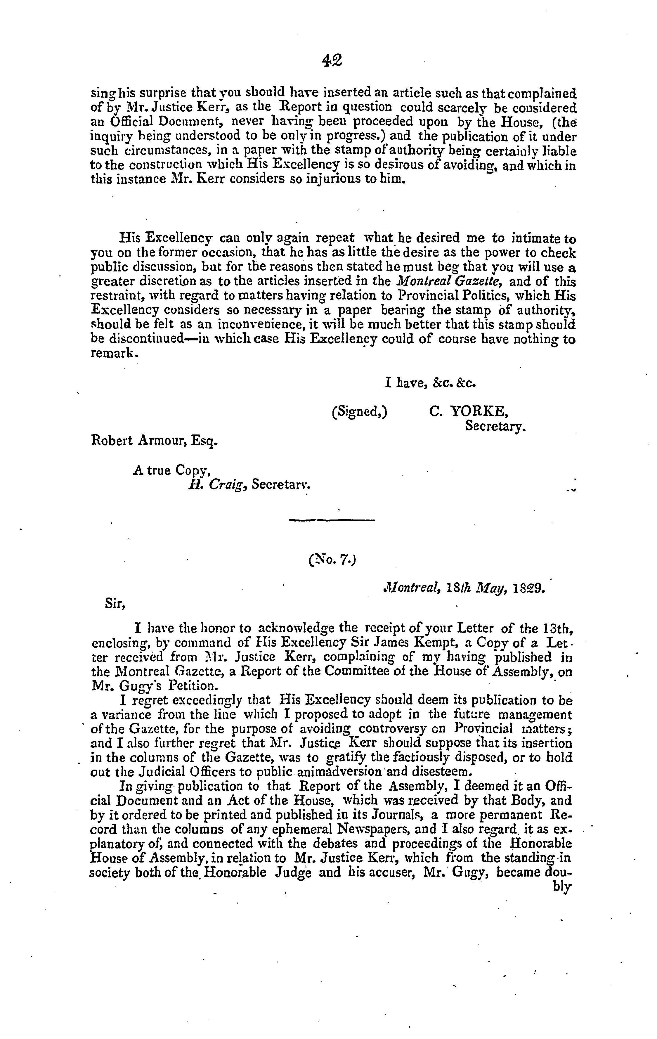 Half-title: Message : Aylmer, Governor in Chief, In compliance with the request of the House of Assembly of the 25th November, the Governor in Chief transmits copies of the correspondence required regardings the Honble. James Kerr, judge of the Court of Vice-Admiralty ... = Message : Aylmer, Gouverneur en Chef, Conformément à la demande contenue dans l'adresse de la Chambre d'assemblée du 25 novembre, le Gouverneur en Chef transmet des copies de la correspondance demandée touchant l'Honble. James Kerr ..., juge de la Cour de vice-amirauté ...