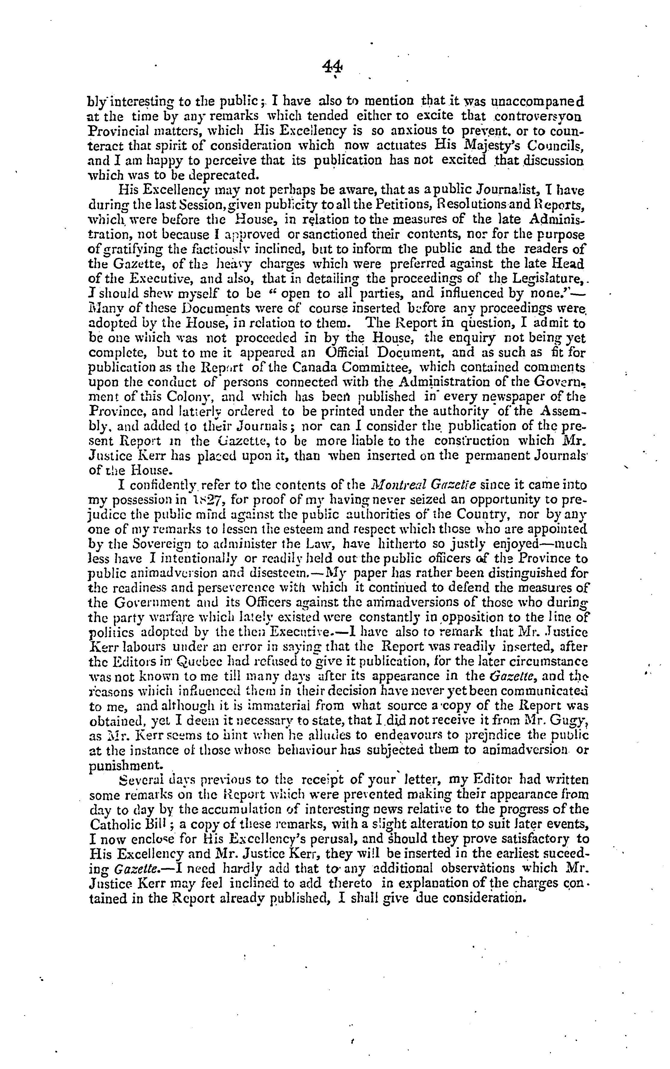 Half-title: Message : Aylmer, Governor in Chief, In compliance with the request of the House of Assembly of the 25th November, the Governor in Chief transmits copies of the correspondence required regardings the Honble. James Kerr, judge of the Court of Vice-Admiralty ... = Message : Aylmer, Gouverneur en Chef, Conformément à la demande contenue dans l'adresse de la Chambre d'assemblée du 25 novembre, le Gouverneur en Chef transmet des copies de la correspondance demandée touchant l'Honble. James Kerr ..., juge de la Cour de vice-amirauté ...