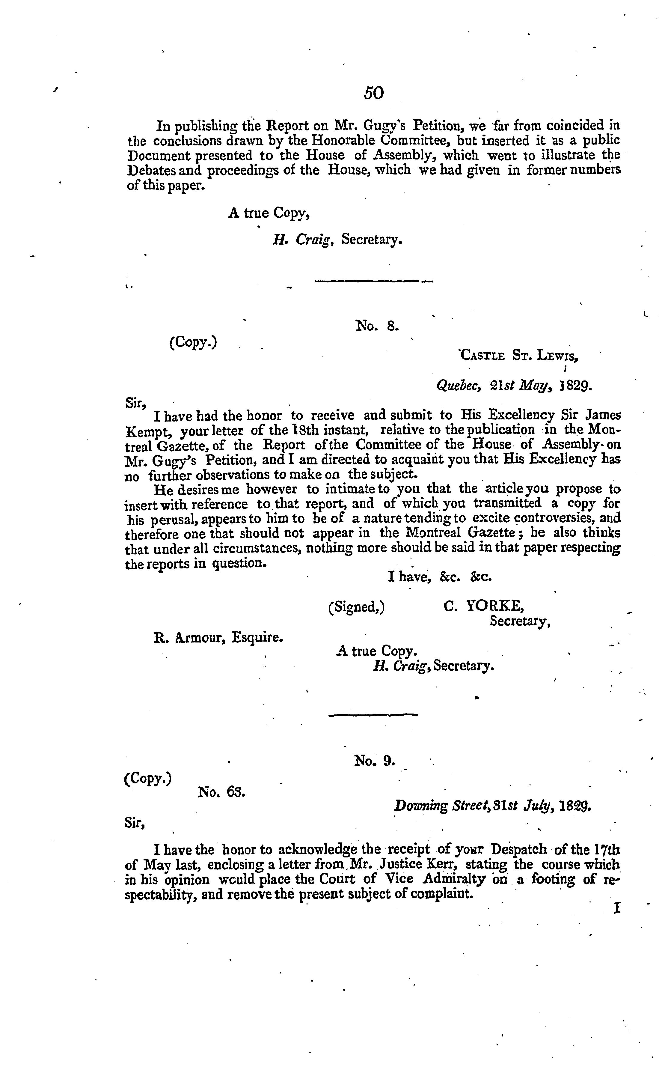 Half-title: Message : Aylmer, Governor in Chief, In compliance with the request of the House of Assembly of the 25th November, the Governor in Chief transmits copies of the correspondence required regardings the Honble. James Kerr, judge of the Court of Vice-Admiralty ... = Message : Aylmer, Gouverneur en Chef, Conformément à la demande contenue dans l'adresse de la Chambre d'assemblée du 25 novembre, le Gouverneur en Chef transmet des copies de la correspondance demandée touchant l'Honble. James Kerr ..., juge de la Cour de vice-amirauté ...