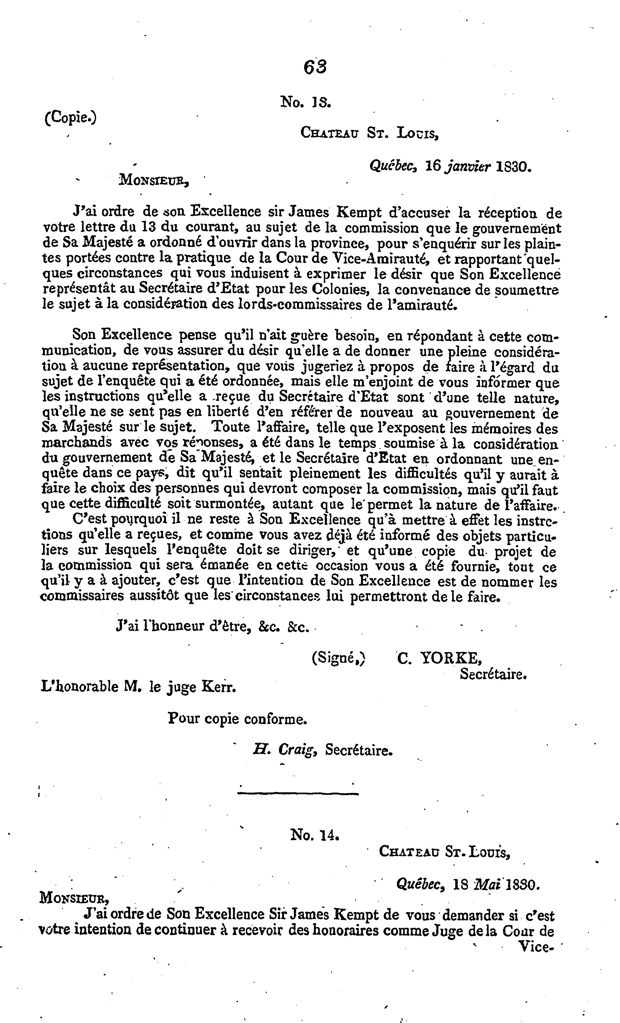 Message : Aylmer, Gouverneur en Chef, Conformément à la demande contenue dans l'adresse de la Chambre d'assemblée du 25 novembre, le Gouverneur en Chef transmet des copies de la correspondance demandée touchant l'Honble. James Kerr ..., juge de la Cour de vice-amirauté ...