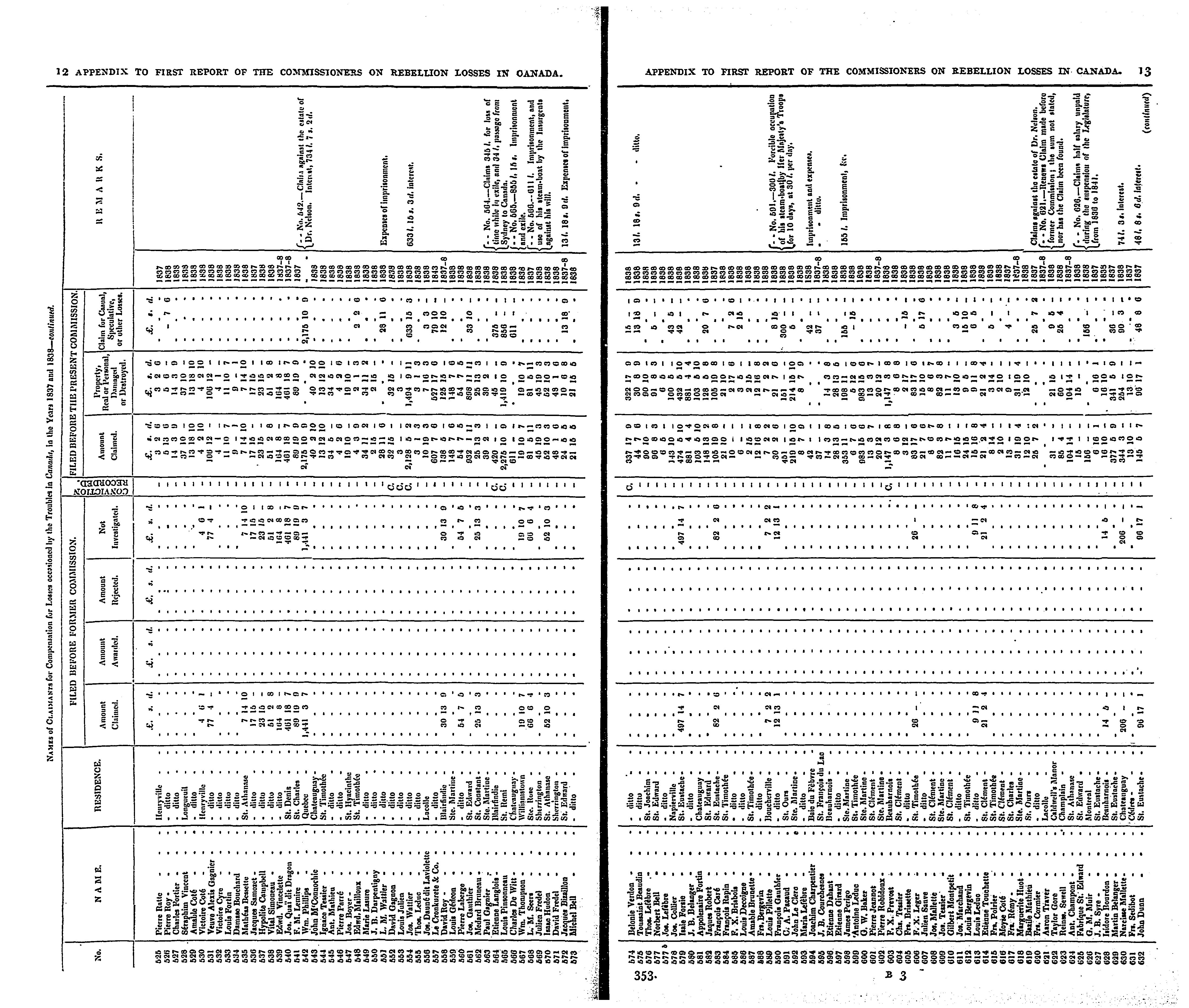 Return to an address of the Honourable the House of Commons, dated 5 June 1849, for, "'The appendix to the first report of the commissioners appointed to inquire into the losses occasioned by the troubles in Canada, during the years 1837 and 1838, and into the damages arising therefrom,' containing a list of the names of the said claimants, referred to in a marginal note of the papers (page 43) relative to the rebellion losses in Canada, ordered by the House of Commons to be printed 2 May 1849, sessional paper, no. 253"