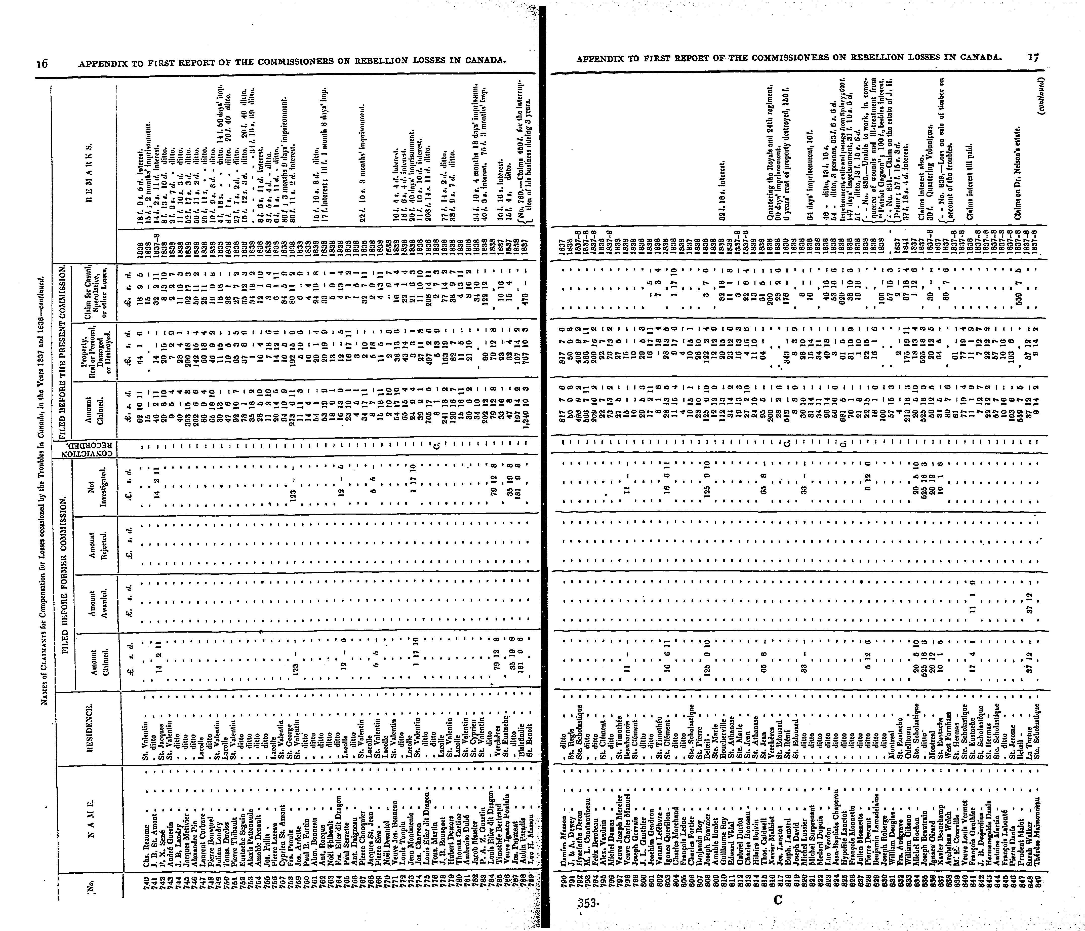 Return to an address of the Honourable the House of Commons, dated 5 June 1849, for, "'The appendix to the first report of the commissioners appointed to inquire into the losses occasioned by the troubles in Canada, during the years 1837 and 1838, and into the damages arising therefrom,' containing a list of the names of the said claimants, referred to in a marginal note of the papers (page 43) relative to the rebellion losses in Canada, ordered by the House of Commons to be printed 2 May 1849, sessional paper, no. 253"