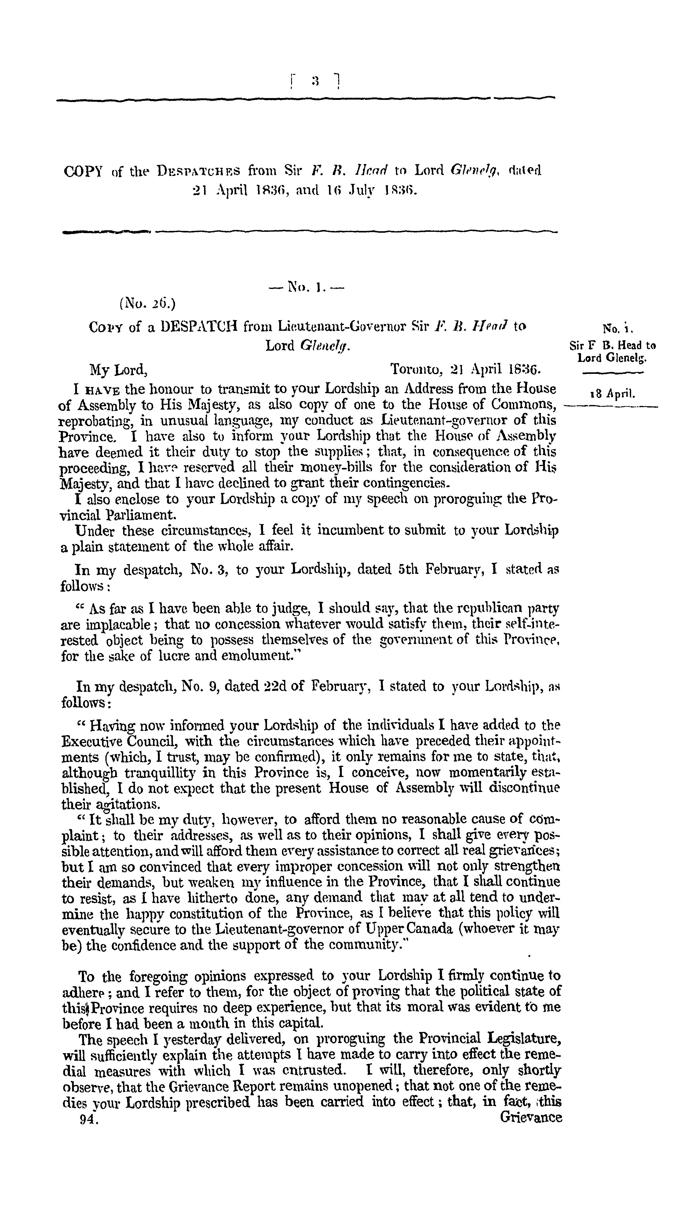 Cover title: Upper Canada : copy of the despatches from Sir F.B. Head to Lord Glenelg, dated 21 April 1836 and 16 July 1836.