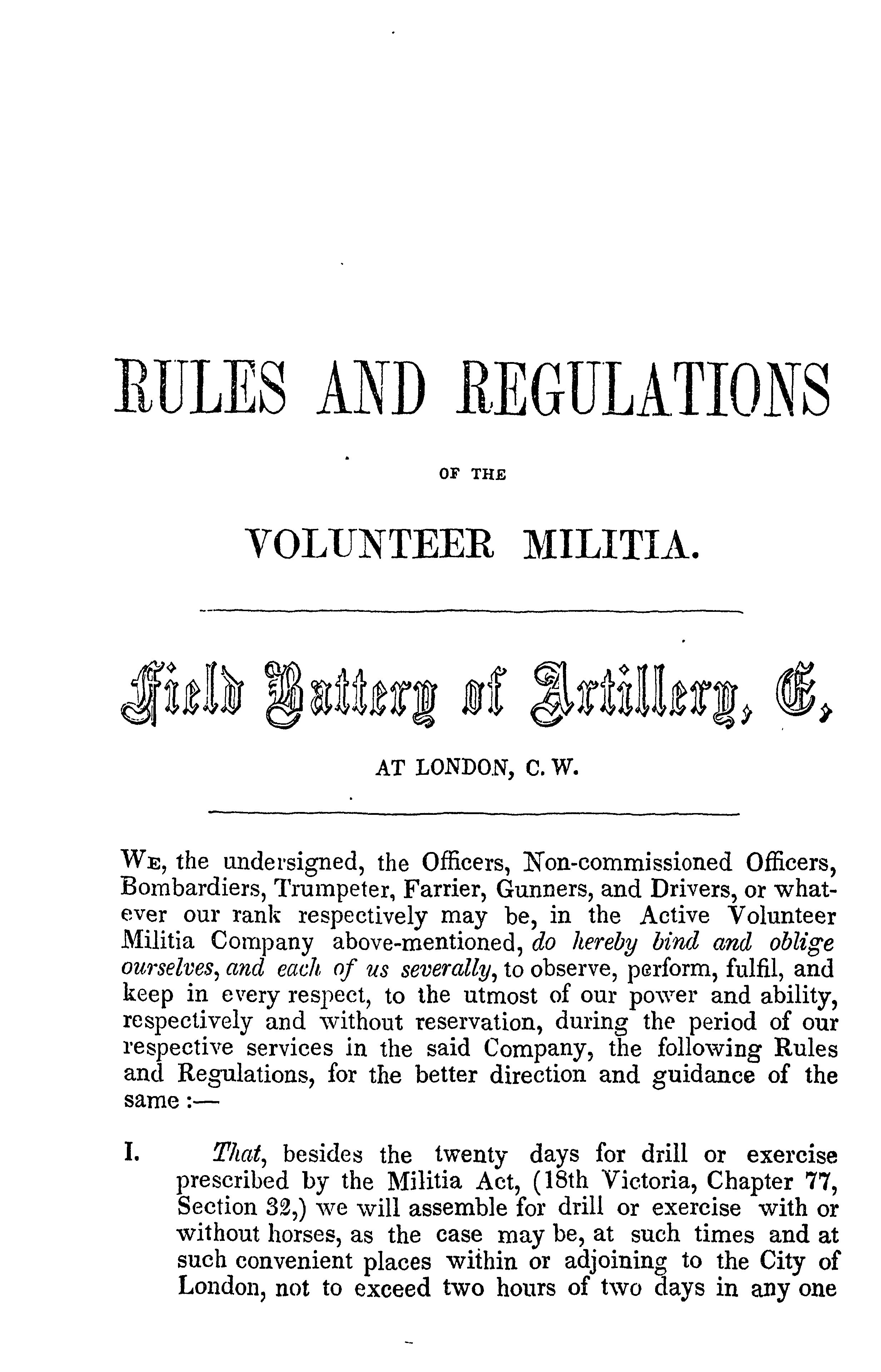 The militia law of Canada, for the organization of the field batteries of artillery, active force, and the rules of field battery, E /