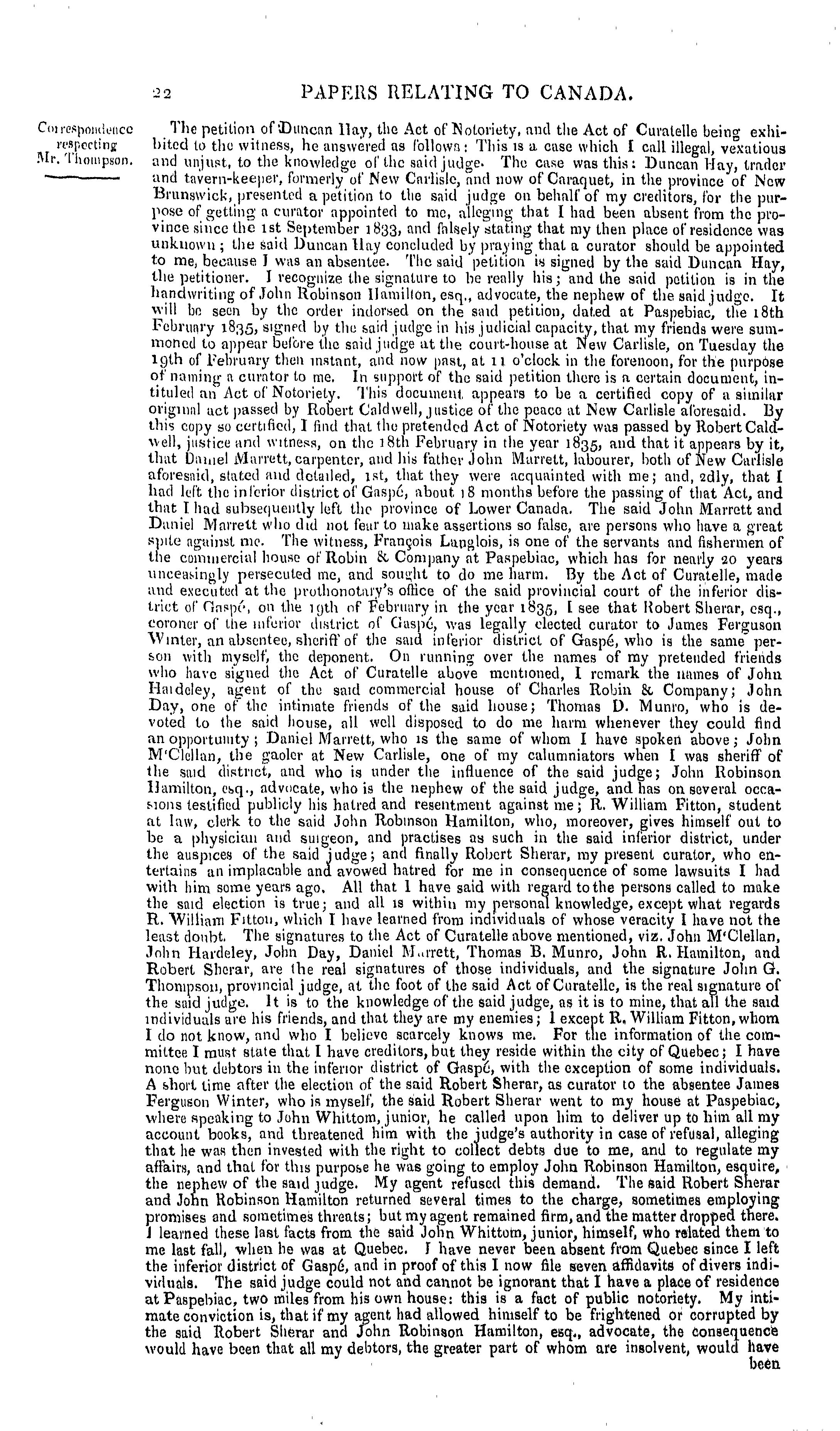 Canada : return to an address of the Honourable the House of Commons, dated 16 March 1837 for: Copy of the agreement concluded between His Majesty's government and the British American Land Company, in the year 1833 ...; Copies of a report of the Select Committee of the House of Assembly of Lower Canada, respecting Mr. Thompson, judge of the Inferior District of Gaspé ...; Copies of a report of the Select Committee of the House of Assembly of Lower Canada, respecting Mr. Whitcher, sherriff of St. Francis ...; Copies of two reports of a Select Committee of the House of Assembly of Lower Canada, respecting Mr. Felton ...