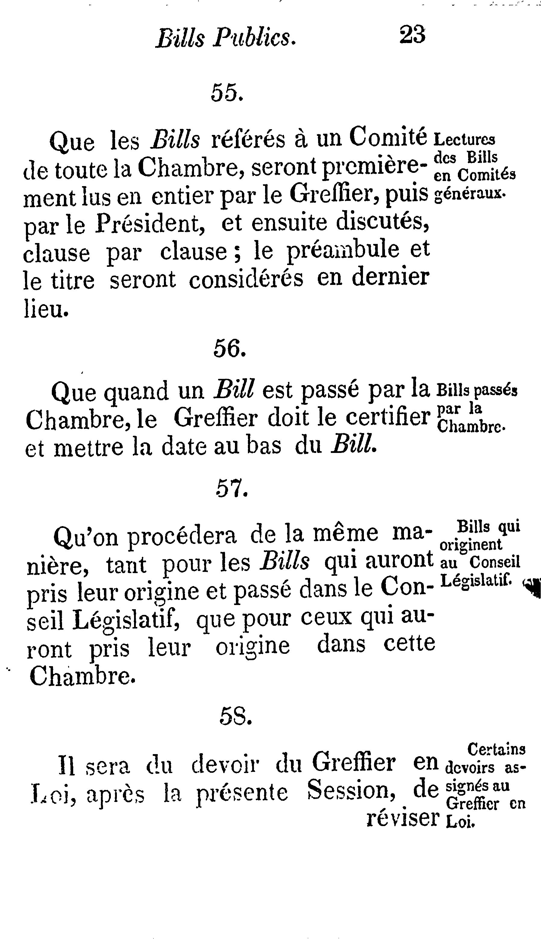Règles et règlements permanents de l'Assemblée législative du Canada :