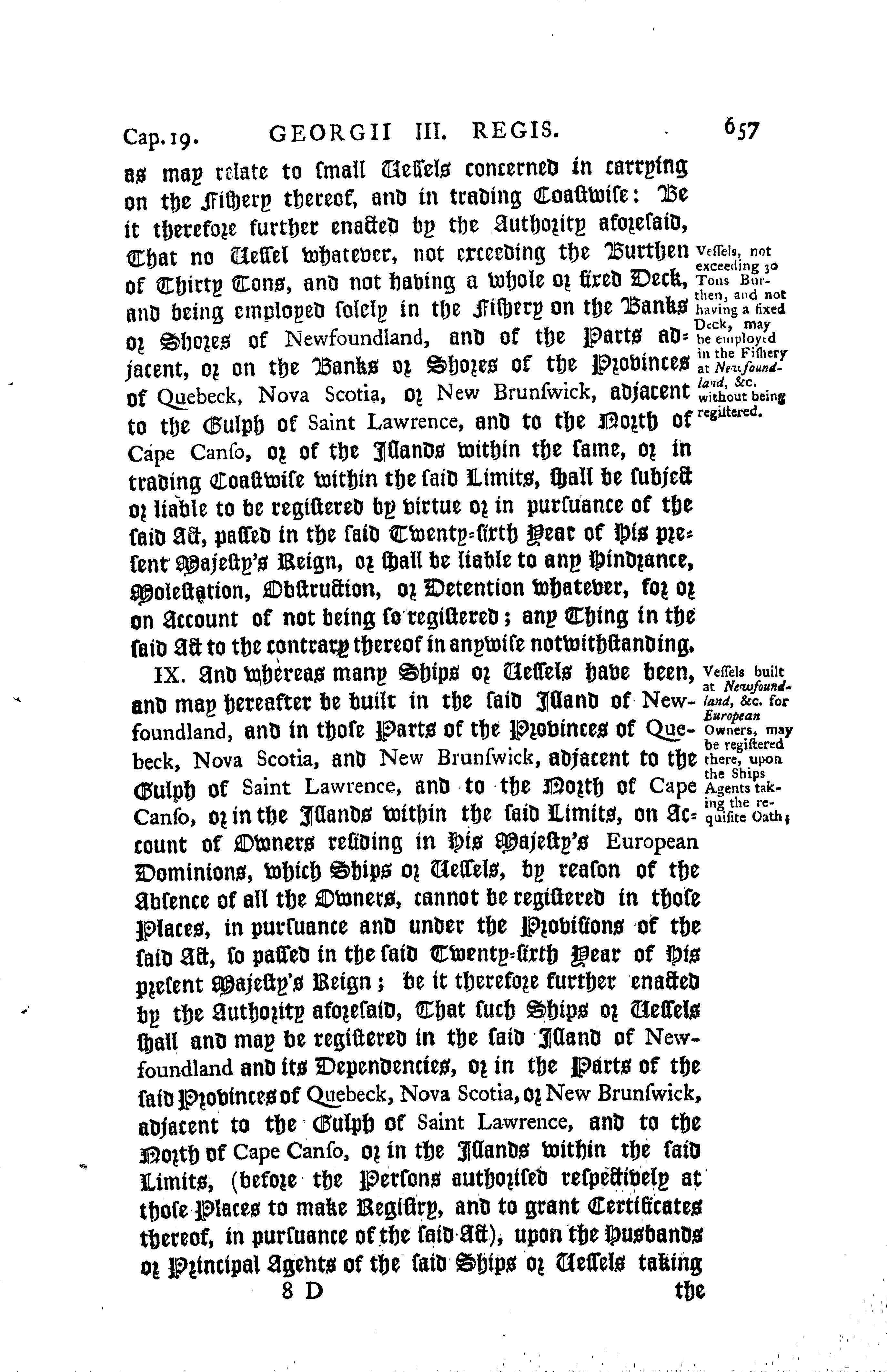 Concerns the registration of vessels, and states that "for want of a sufficient number of proper officers in the Island of Newfoundland, and its dependencies, and in some parts of the provinces of Quebeck, Nova Scotia, and New Brunswick" small ships "concerned in carrying out the fishery thereof, and in trading coastwise" need not be registered. Cf. pages 656-657.