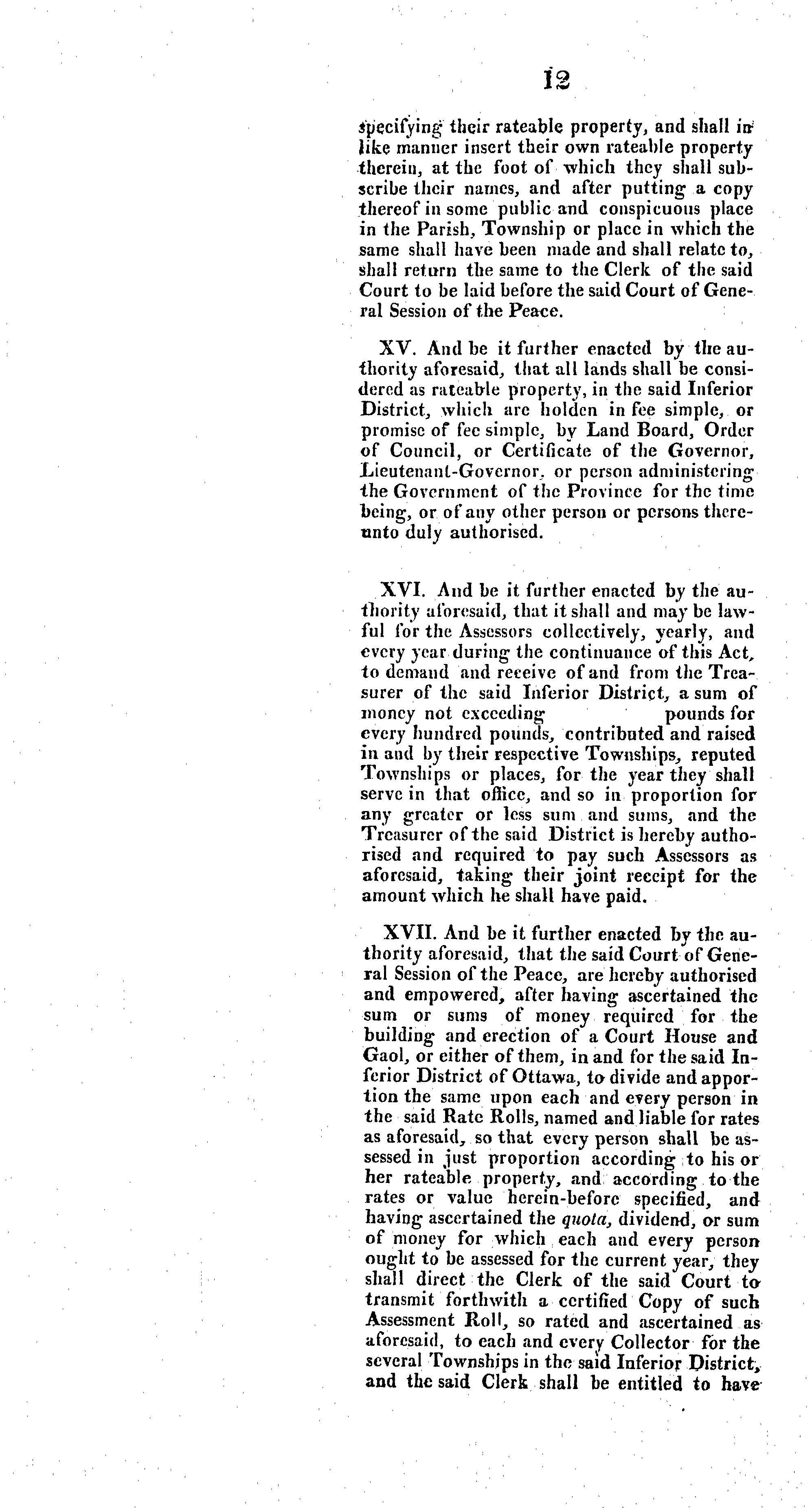 Bill to erect certain townships adjacent to the river Ottawa, into an inferior district, to be called the Inferior District of Ottawa, to erect a court of inferior jurisdiction and genral session of the peace, in the said Inferior District, and for the ease and relief of the inhabitants therein residing = Bill pour ériger certains townships [sic], auprès de la Rivière des Outaouais, en un District Inférieur, qui doit être appellé le District Inférieur des Outaouais, pour ériger une Cour de Jurîdiction Inférieure et de Sessions Générales de la Paix dans le dit District Inférieur, et pour la commodité et le soulagement des habitans qui y résident. - Adresse bibliographique