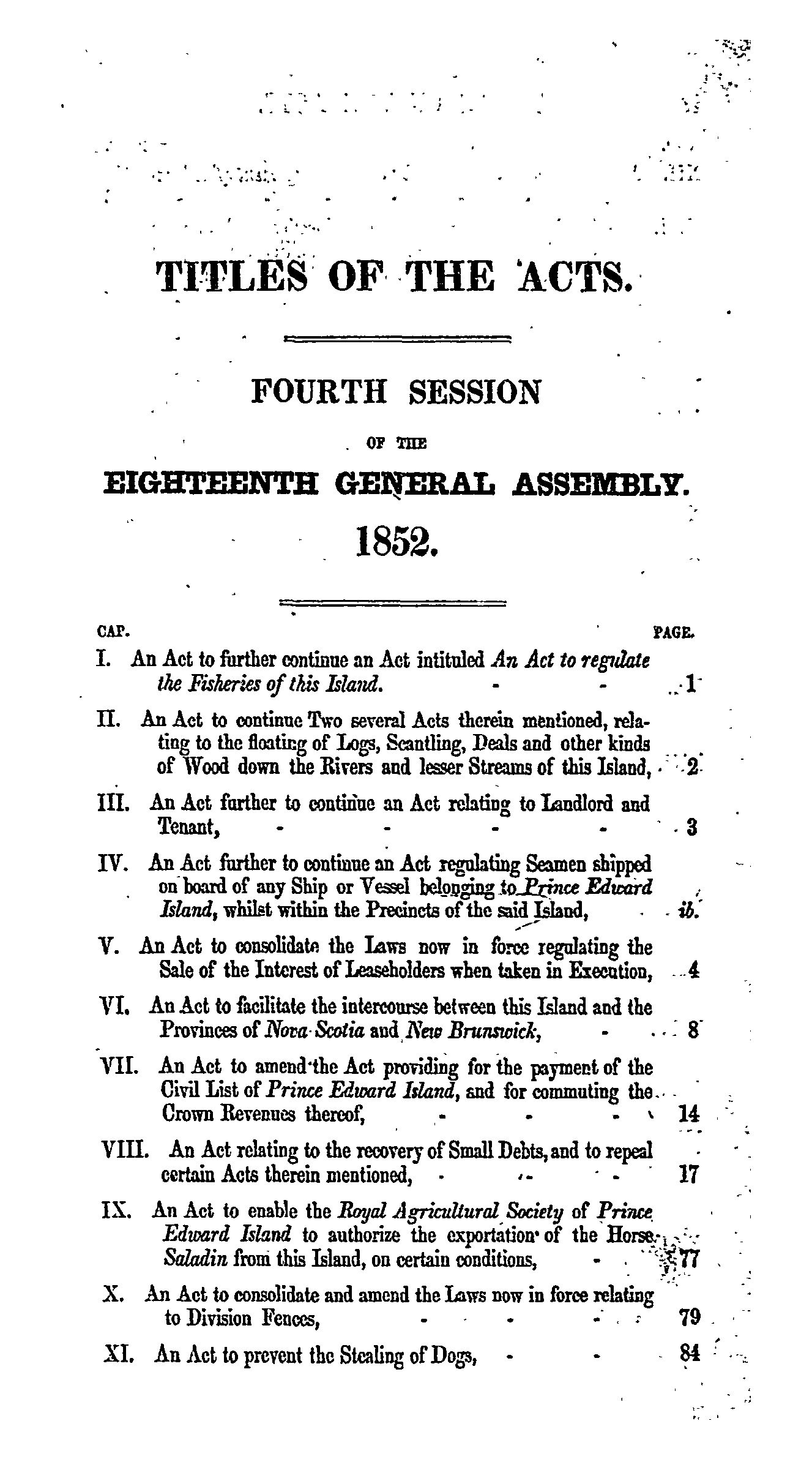 The acts of the General Assembly of Prince Edward Island, anno decimo quinto Victoriæ reginæ [1852] : 1852