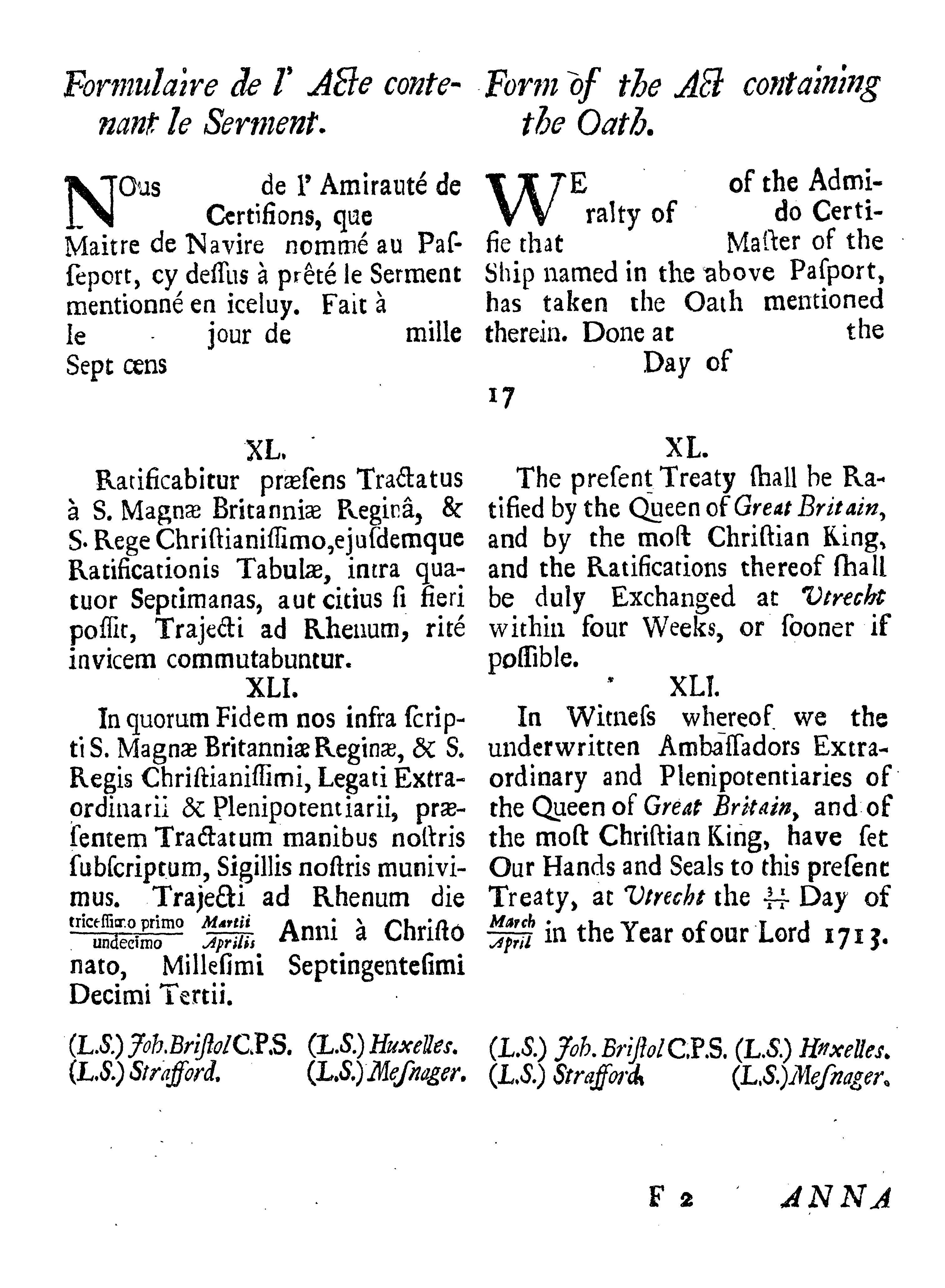 Tractatus navigationis et commerciorum : inter Serenissimam ac Potentissimam Principem Annam, Dei Gratia, Magnæ Britanniæ, Franciæ, & Hibernæ, Reginam, & Serenissimum ac Potentissimum Principem Ludovicum XIV, Dei Gratia, Regem Christianissimum, conclusus trajecti ad Rhenum die 31 Martii/11 Aprils anno 1713 = Treaty of navigation and commerce : between the Most Serene and Most Potent Princess Anne, by the Grace of God, Queen of Great Britain, France, and Ireland, and the Most Potent Prince Lewis the XIVth, the Most Christian king, concluded at Utrecht the 31/11 day of March/April 1713.