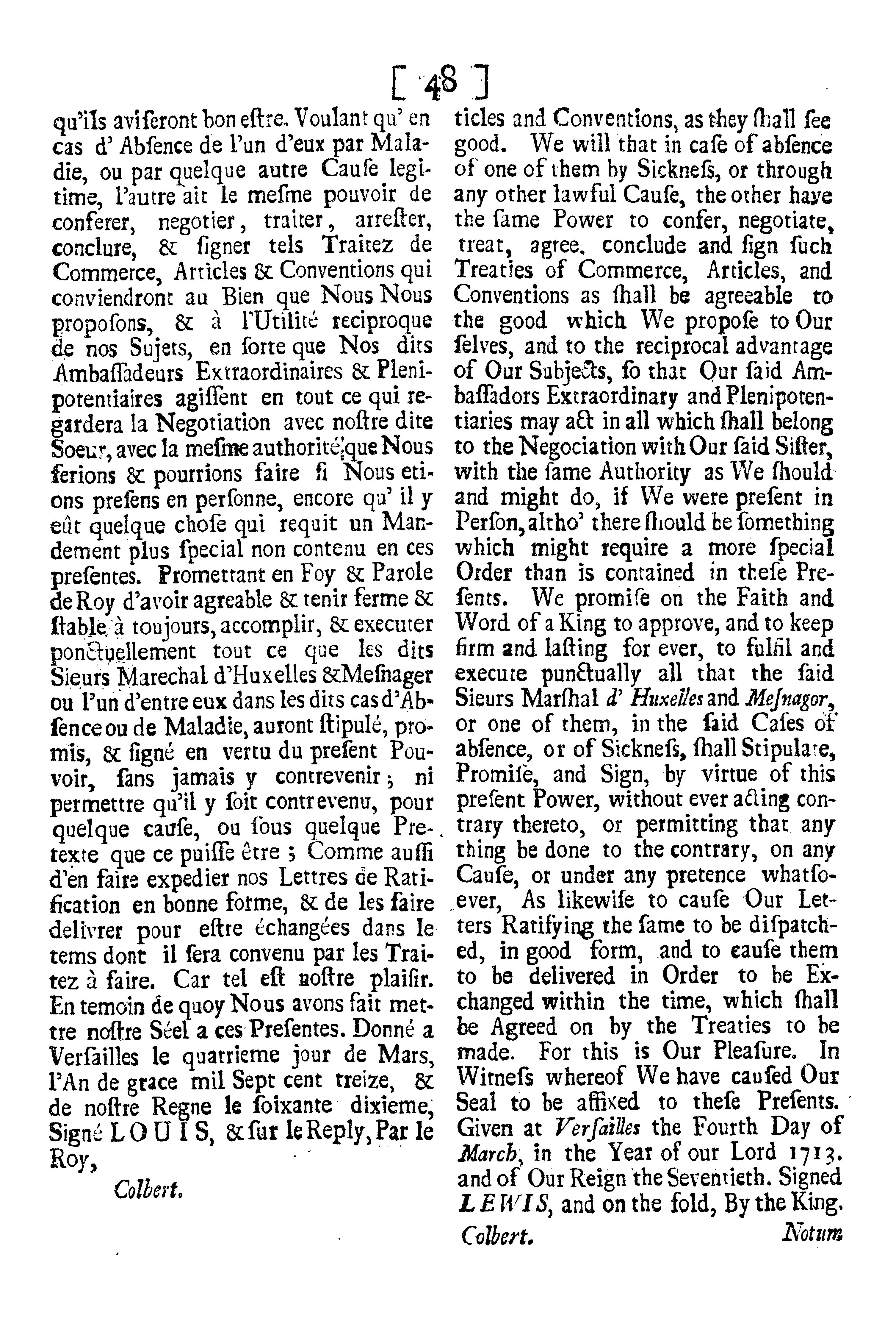 Tractatus navigationis et commerciorum : inter Serenissimam ac Potentissimam Principem Annam, Dei Gratia, Magnæ Britanniæ, Franciæ, & Hibernæ, Reginam, & Serenissimum ac Potentissimum Principem Ludovicum XIV, Dei Gratia, Regem Christianissimum, conclusus trajecti ad Rhenum die 31 Martii/11 Aprils anno 1713 = Treaty of navigation and commerce : between the Most Serene and Most Potent Princess Anne, by the Grace of God, Queen of Great Britain, France, and Ireland, and the Most Potent Prince Lewis the XIVth, the Most Christian king, concluded at Utrecht the 31/11 day of March/April 1713.