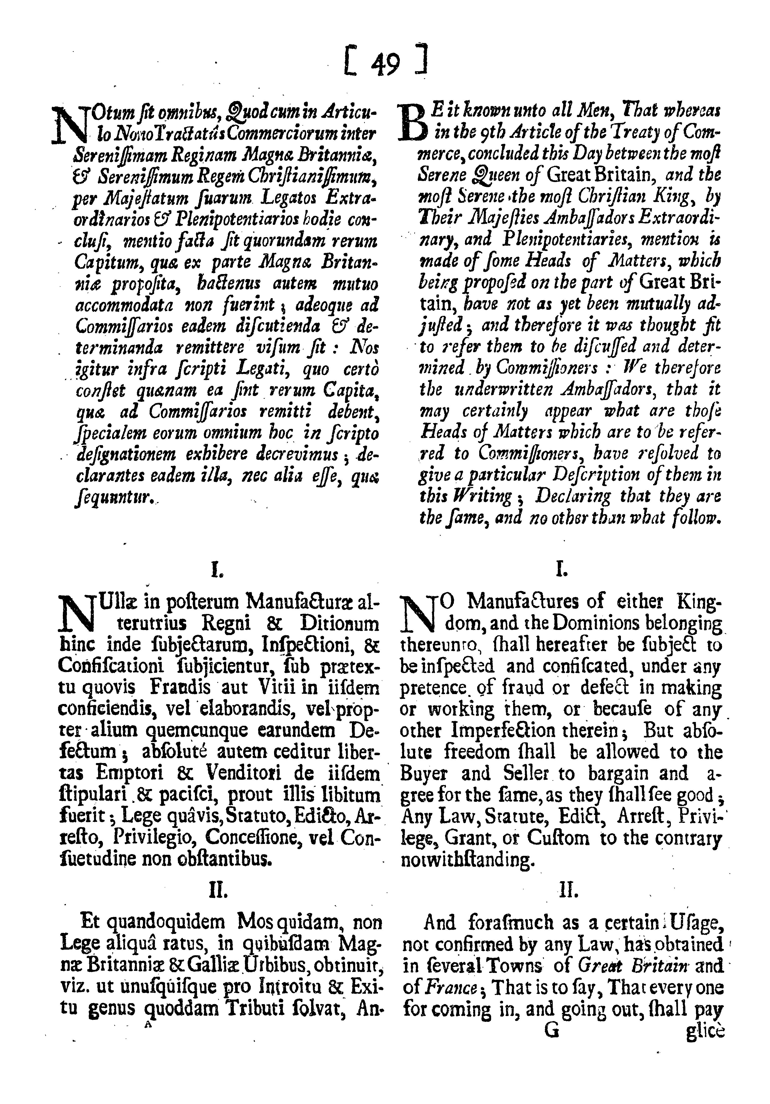 Tractatus navigationis et commerciorum : inter Serenissimam ac Potentissimam Principem Annam, Dei Gratia, Magnæ Britanniæ, Franciæ, & Hibernæ, Reginam, & Serenissimum ac Potentissimum Principem Ludovicum XIV, Dei Gratia, Regem Christianissimum, conclusus trajecti ad Rhenum die 31 Martii/11 Aprils anno 1713 = Treaty of navigation and commerce : between the Most Serene and Most Potent Princess Anne, by the Grace of God, Queen of Great Britain, France, and Ireland, and the Most Potent Prince Lewis the XIVth, the Most Christian king, concluded at Utrecht the 31/11 day of March/April 1713. - Adresse bibliographique