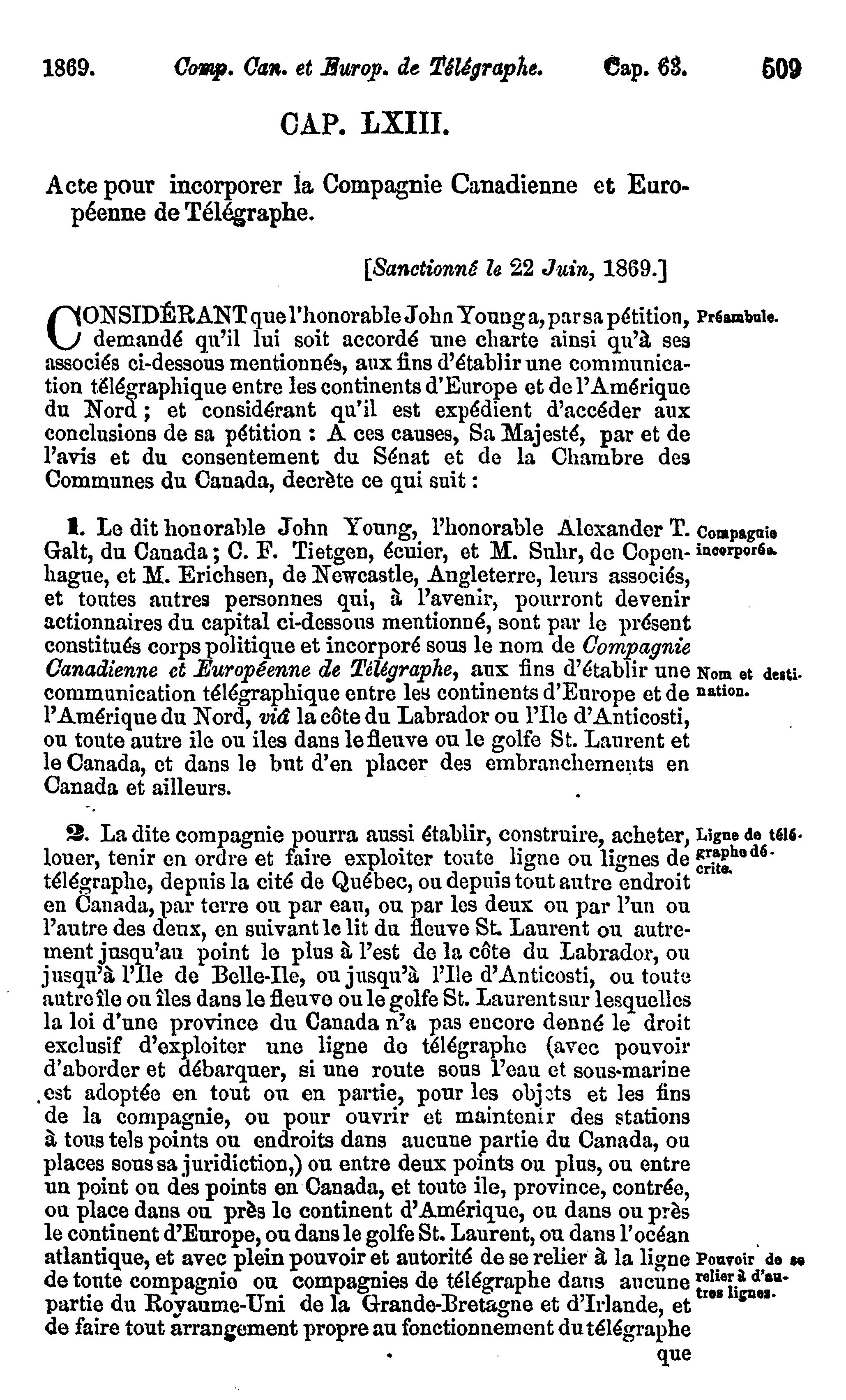 Statuts du Canada passés dans la session tenue dans les trente-deuxième et trente-toisième année du règne de Sa Majesté la Reine Victoria, étant la seconde sesson du premier parlement du Canada : commencée et tenue à Ottawa le quinzième jour d'avril 1869, et ajournée par prorogation le vingt-deuxième jour de juin, dans la même année