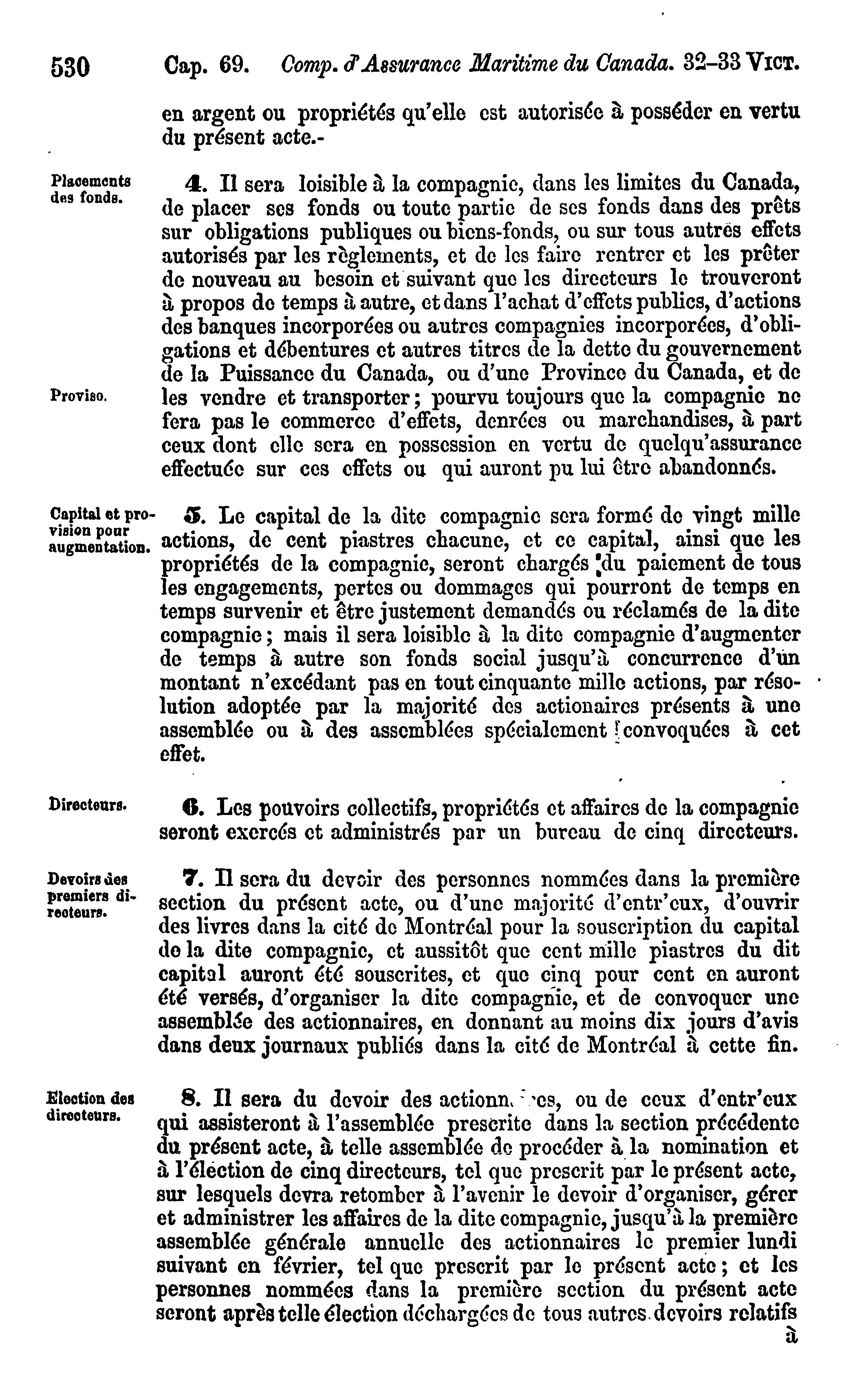 Statuts du Canada passés dans la session tenue dans les trente-deuxième et trente-toisième année du règne de Sa Majesté la Reine Victoria, étant la seconde sesson du premier parlement du Canada : commencée et tenue à Ottawa le quinzième jour d'avril 1869, et ajournée par prorogation le vingt-deuxième jour de juin, dans la même année