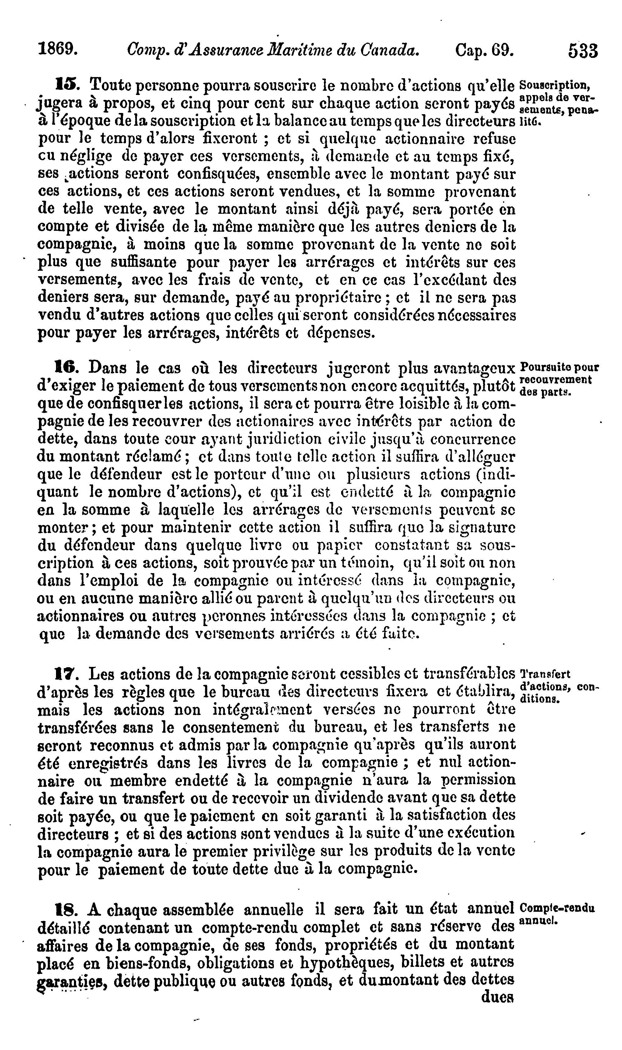 Statuts du Canada passés dans la session tenue dans les trente-deuxième et trente-toisième année du règne de Sa Majesté la Reine Victoria, étant la seconde sesson du premier parlement du Canada : commencée et tenue à Ottawa le quinzième jour d'avril 1869, et ajournée par prorogation le vingt-deuxième jour de juin, dans la même année