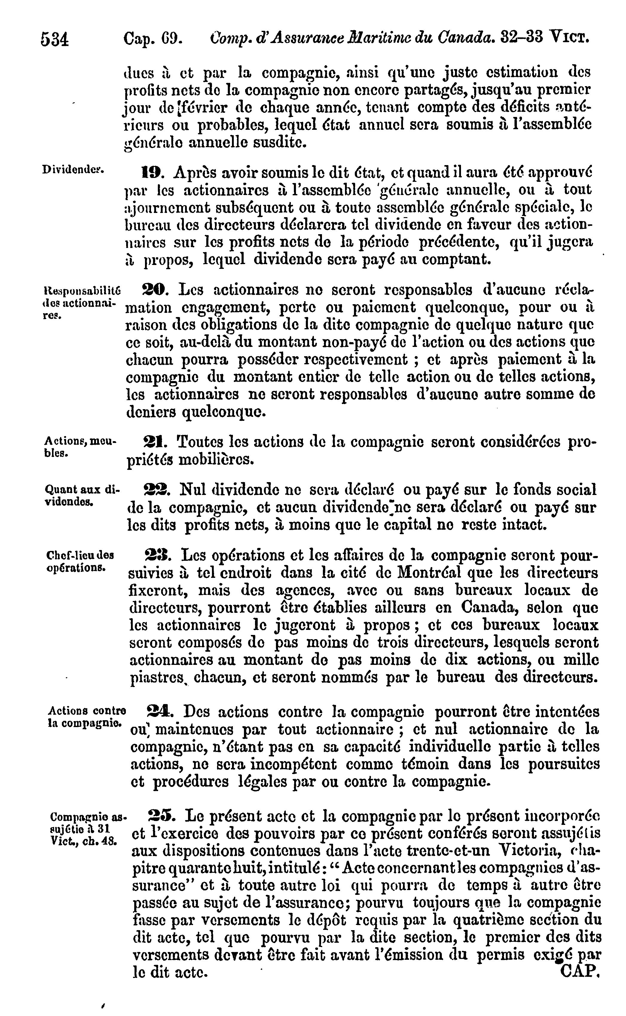 Statuts du Canada passés dans la session tenue dans les trente-deuxième et trente-toisième année du règne de Sa Majesté la Reine Victoria, étant la seconde sesson du premier parlement du Canada : commencée et tenue à Ottawa le quinzième jour d'avril 1869, et ajournée par prorogation le vingt-deuxième jour de juin, dans la même année