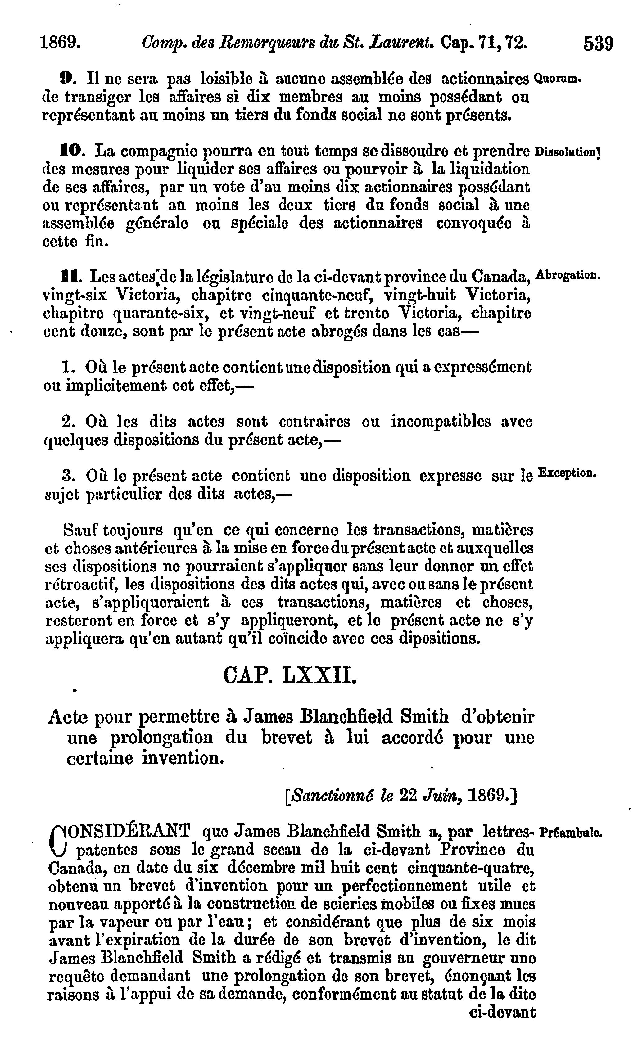 Statuts du Canada passés dans la session tenue dans les trente-deuxième et trente-toisième année du règne de Sa Majesté la Reine Victoria, étant la seconde sesson du premier parlement du Canada : commencée et tenue à Ottawa le quinzième jour d'avril 1869, et ajournée par prorogation le vingt-deuxième jour de juin, dans la même année
