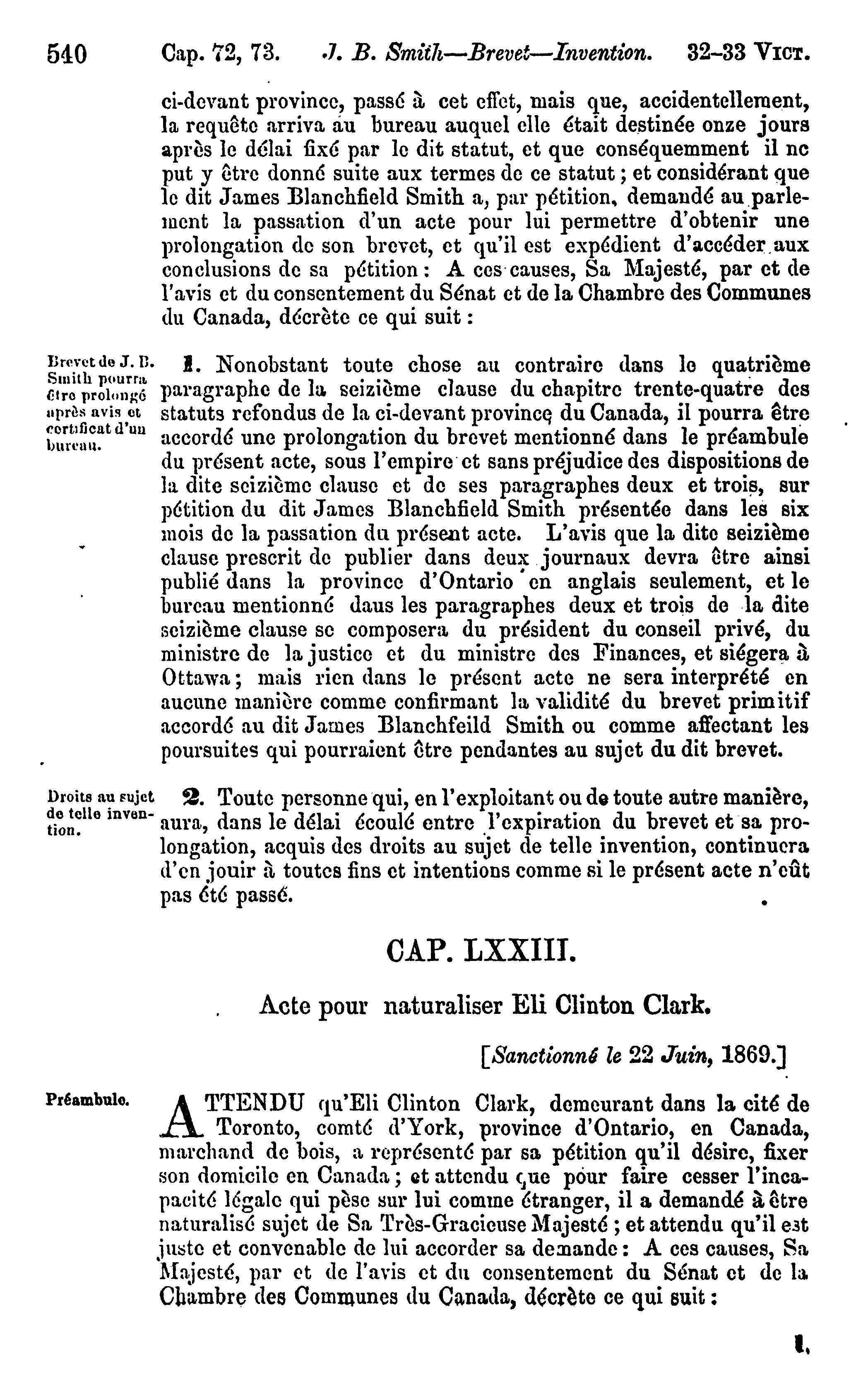 Statuts du Canada passés dans la session tenue dans les trente-deuxième et trente-toisième année du règne de Sa Majesté la Reine Victoria, étant la seconde sesson du premier parlement du Canada : commencée et tenue à Ottawa le quinzième jour d'avril 1869, et ajournée par prorogation le vingt-deuxième jour de juin, dans la même année