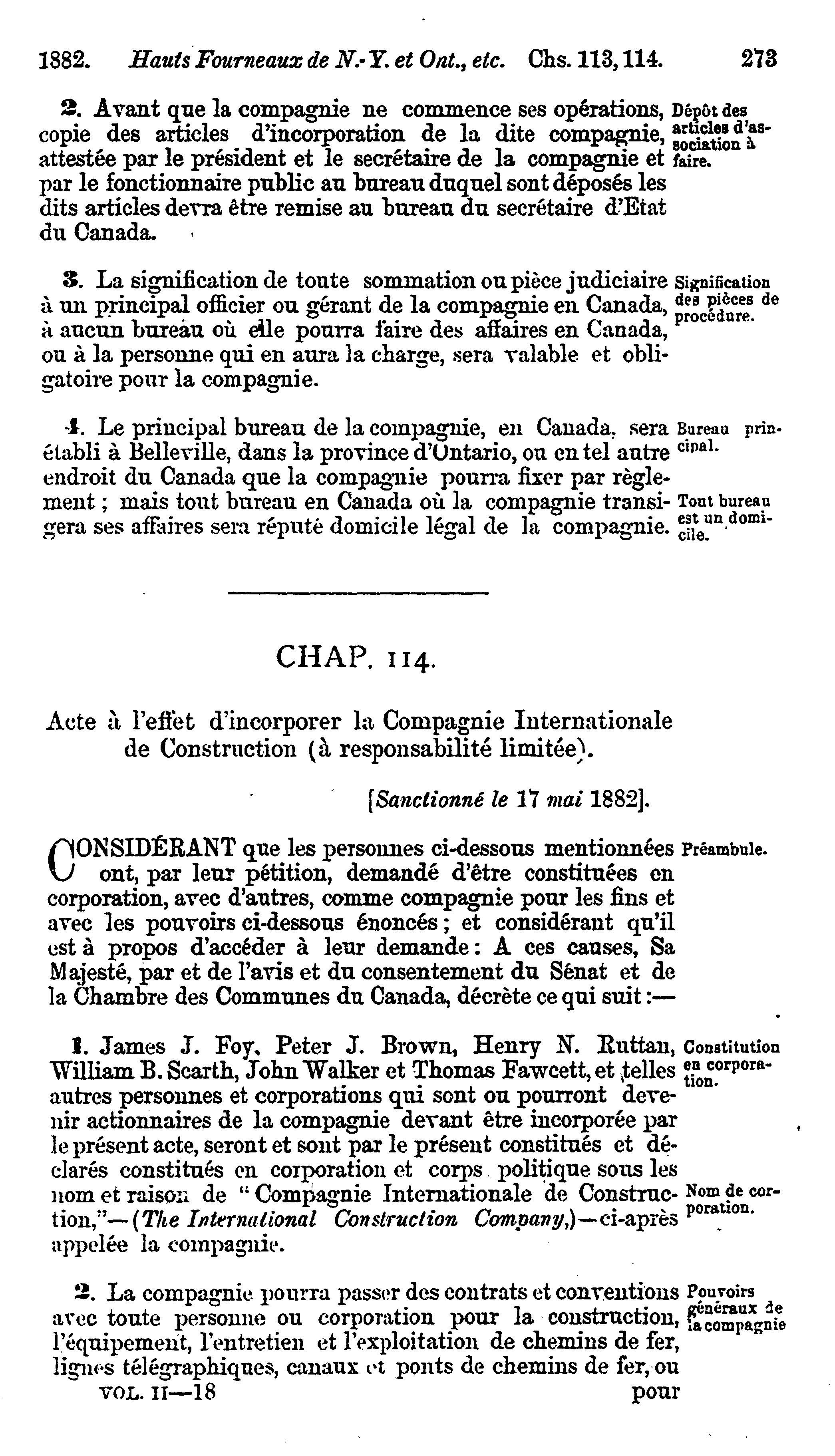 Actes du parlement de la puissance du Canada passés dans la quarante-cinquième année du règne de Sa Majesté, la Reine Victoria, et dans la quatrième session du quatrième parlement : commencée et tenue à Ottawa, le neuvième jour de février , et fermée par prorogation le dix-septième jour de mai 1882 : actes privés et locaux : 1882 (ptie 2) (Actes 56-127)