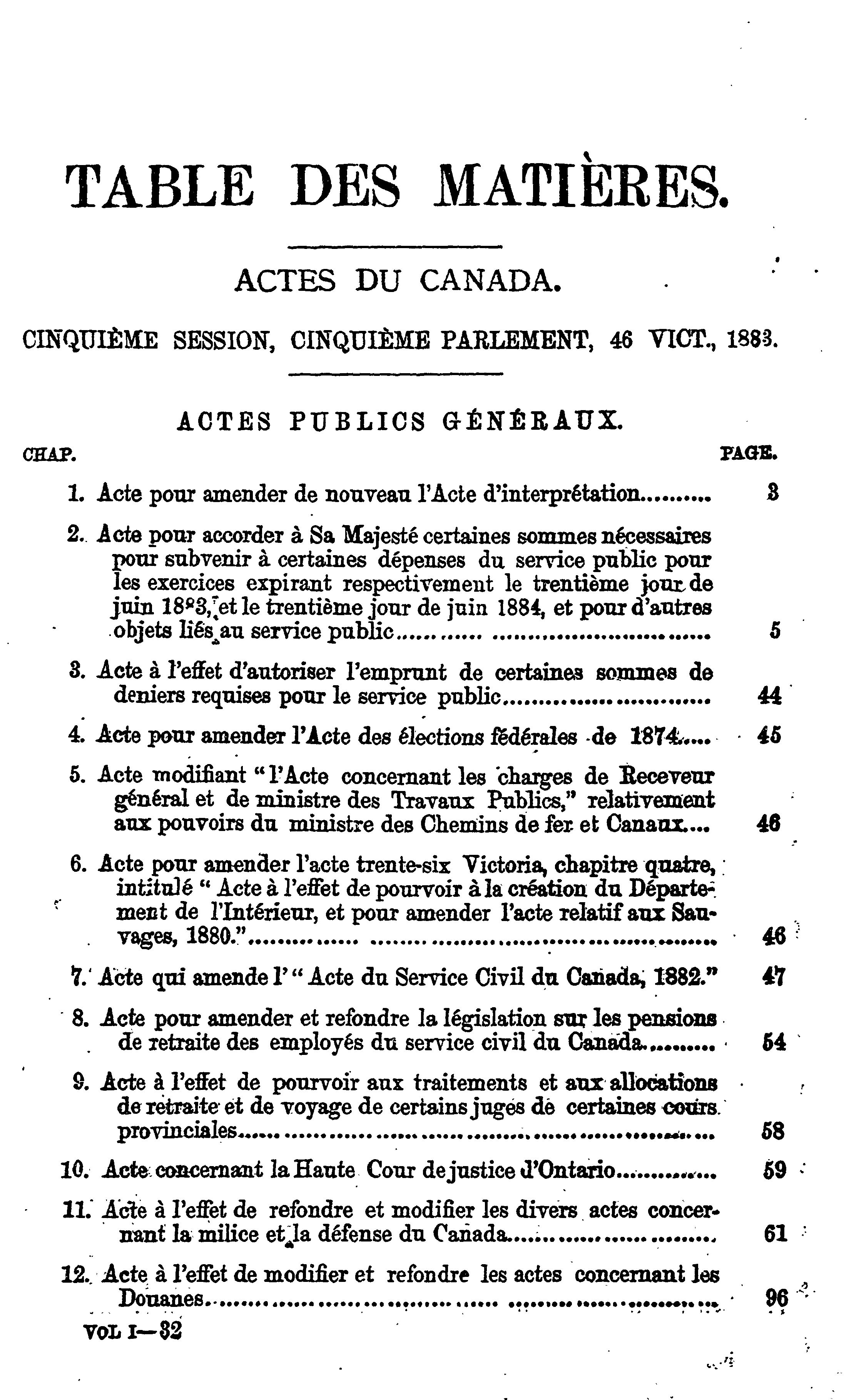 Actes du parlement de la puissance du Canada passés dans la quarante-sixième année du règne de Sa Majesté, la Reine Victoria, et dans la première session du cinquième parlement : commencée et tenue à Ottawa, le huitième jour de février, et fermée par prorogation le vingt-cinquième jour de mai 1883 : actes publics généraux : 1883 (ptie 1) (Actes 1-45)