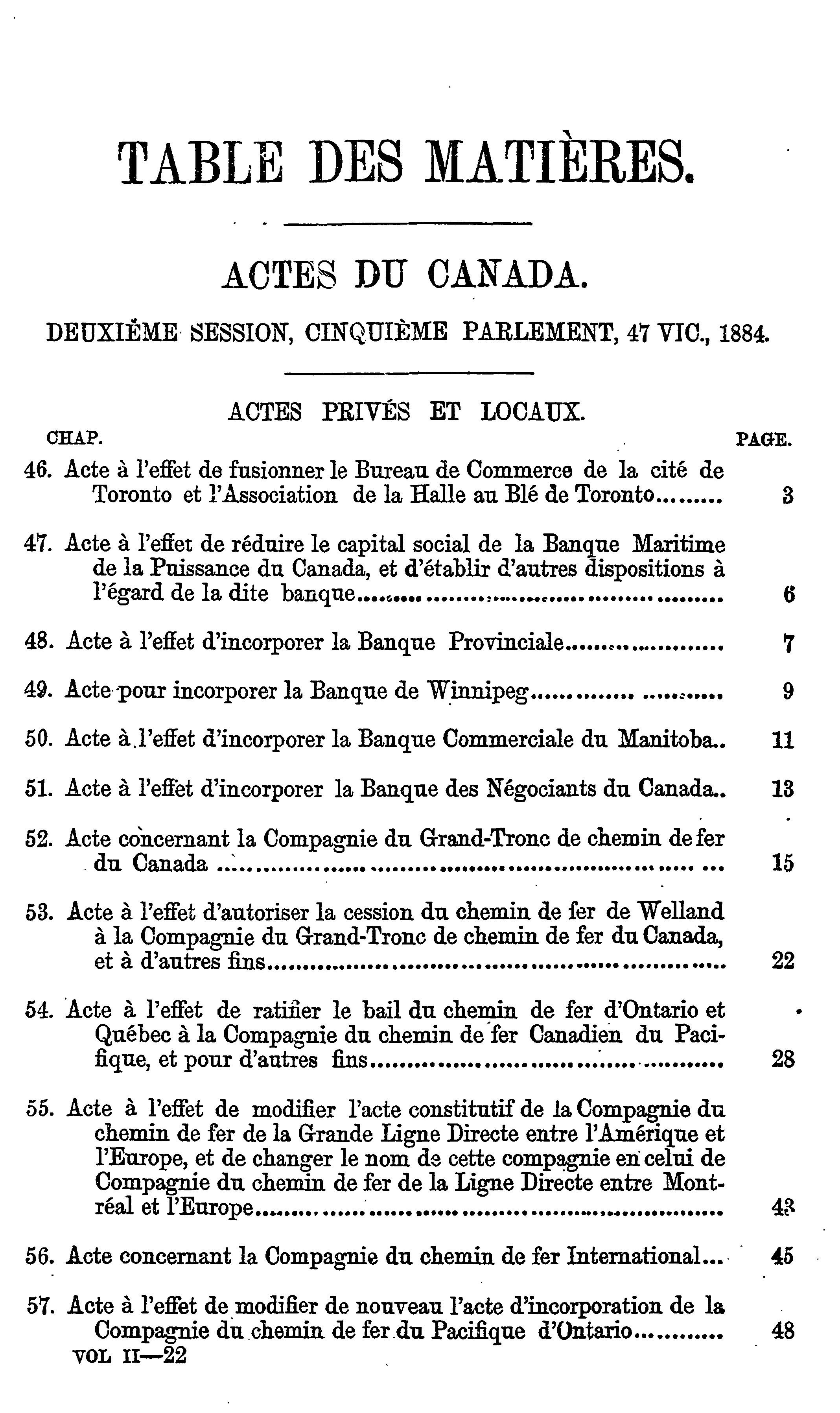 Actes du parlement de la puissance du Canada passés dans la quarante-septième année du règne de Sa Majesté, la Reine Victoria, et dans la deuxième session du cinquième parlement : commencée et tenue à Ottawa, le dix-septième jour de janvier et fermée par prorogation le dix-neuvième jour d'avril 1884 : actes locaux et privés : 1884 (ptie 2) (Actes 46-107)