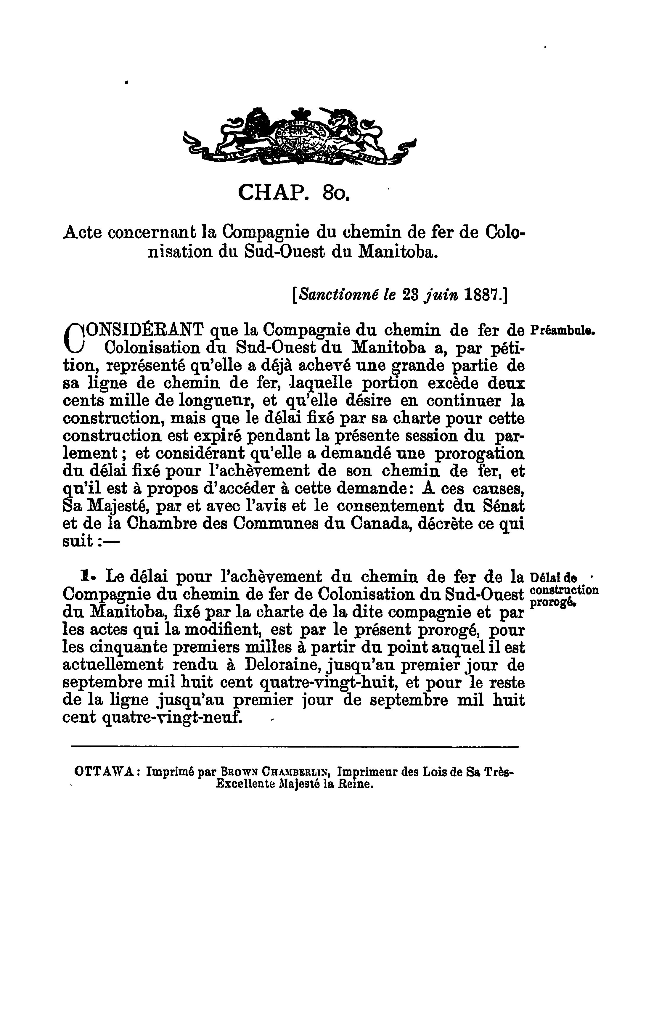 Actes du Parlement de la puissance du Canada : Actes du parlement de la puissance du Canada passés durant la session tenue en les cinquantième et cinquante et unième années du règne de Sa Majesté la Reine Victoria : étant la première session du sixième parlement commencée et tenue à Ottawa, le treizième jour d'avril, et fermée par prorogation le vingt-troisième jour de juin 1887 : actes privés et locaux : 1887 (ptie 2) (Actes 53-131)