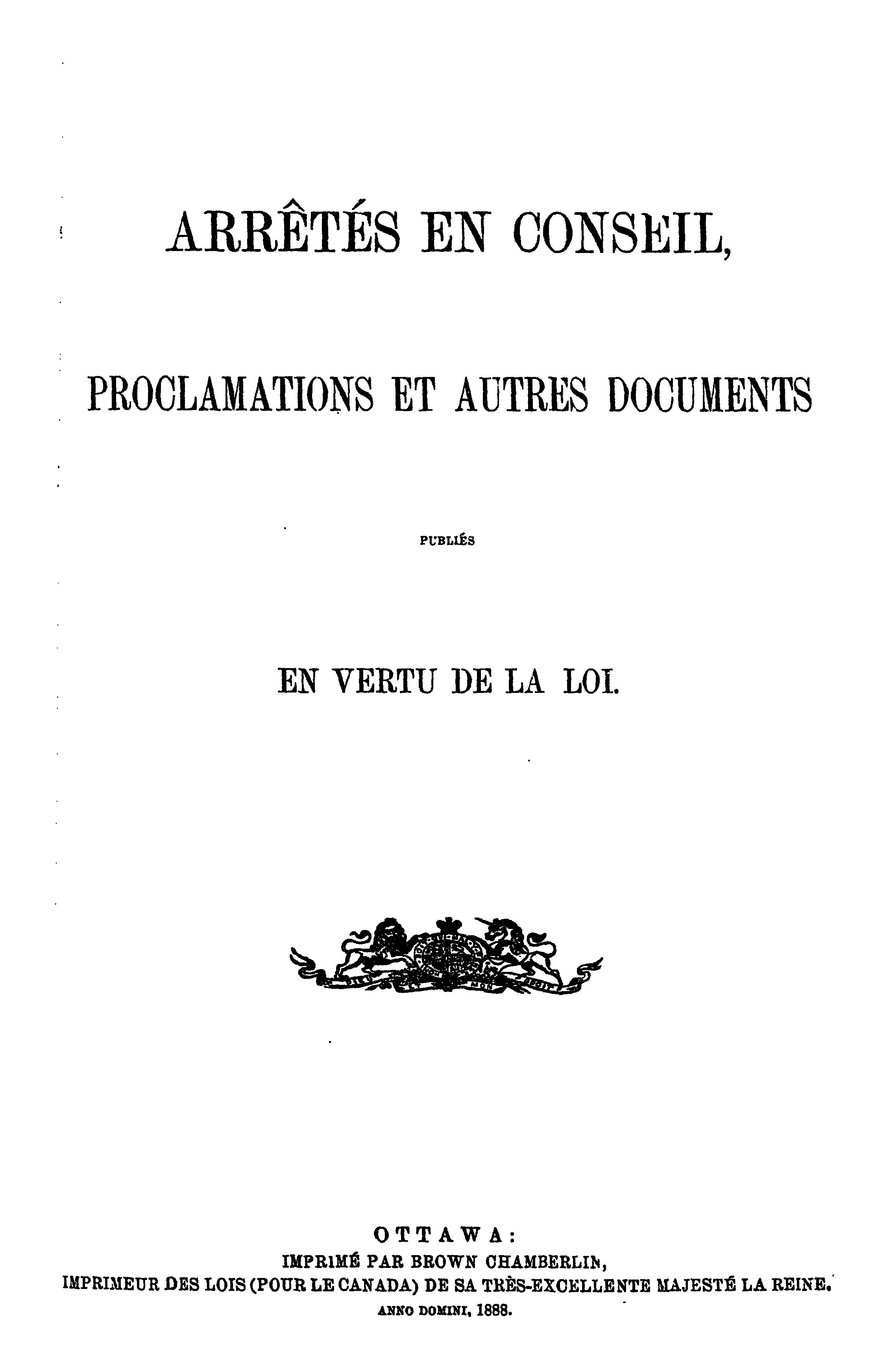 Actes du parlement de la puissance du Canada passés durant la session tenue en la cinquante et unième année du règne de Sa Majesté la Reine Victoria : étant la deuxième session du sixième parlement, commencée et tenue à Ottawa, le vingt-troisième jour de février, et fermée par prorogation le vingt-deuxième jour de mai 1888 : actes publics généraux : 1888 (ptie 1) (Actes 1-47)