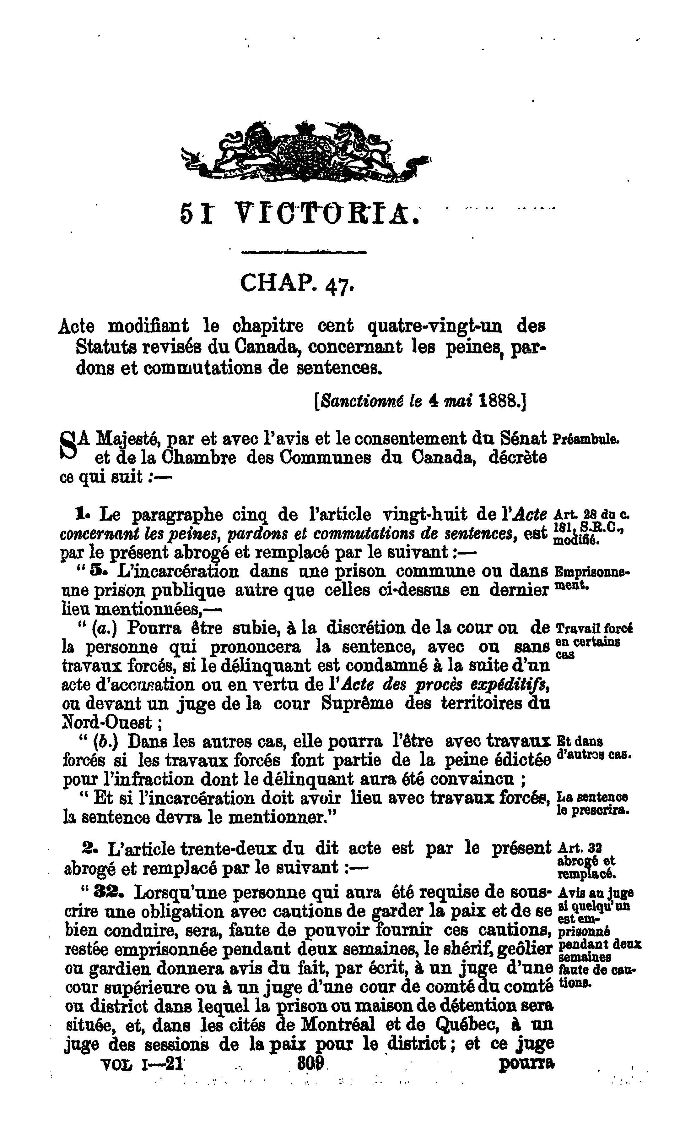 Actes du parlement de la puissance du Canada passés durant la session tenue en la cinquante et unième année du règne de Sa Majesté la Reine Victoria : étant la deuxième session du sixième parlement, commencée et tenue à Ottawa, le vingt-troisième jour de février, et fermée par prorogation le vingt-deuxième jour de mai 1888 : actes publics généraux : 1888 (ptie 1) (Actes 1-47)