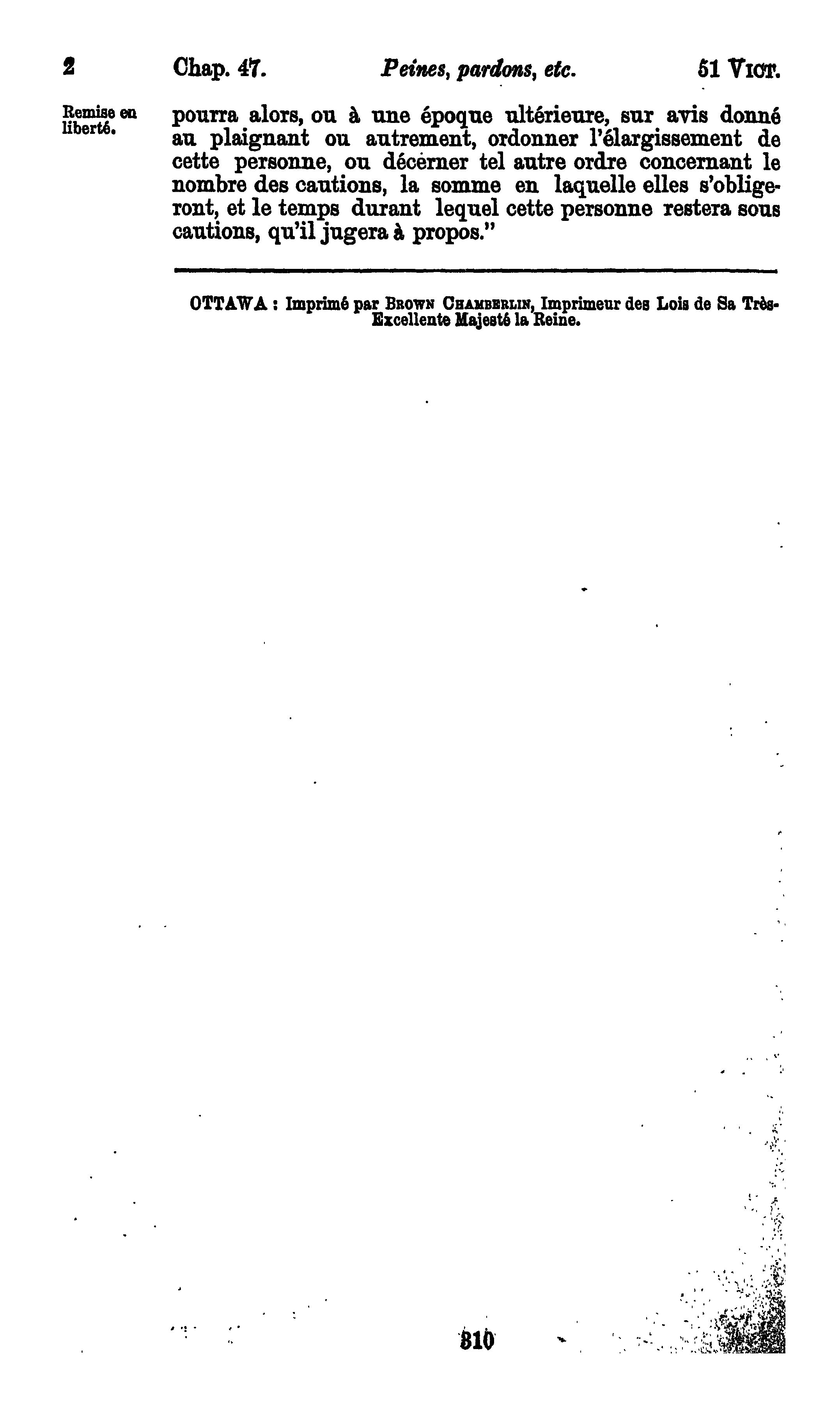 Actes du parlement de la puissance du Canada passés durant la session tenue en la cinquante et unième année du règne de Sa Majesté la Reine Victoria : étant la deuxième session du sixième parlement, commencée et tenue à Ottawa, le vingt-troisième jour de février, et fermée par prorogation le vingt-deuxième jour de mai 1888 : actes publics généraux : 1888 (ptie 1) (Actes 1-47)