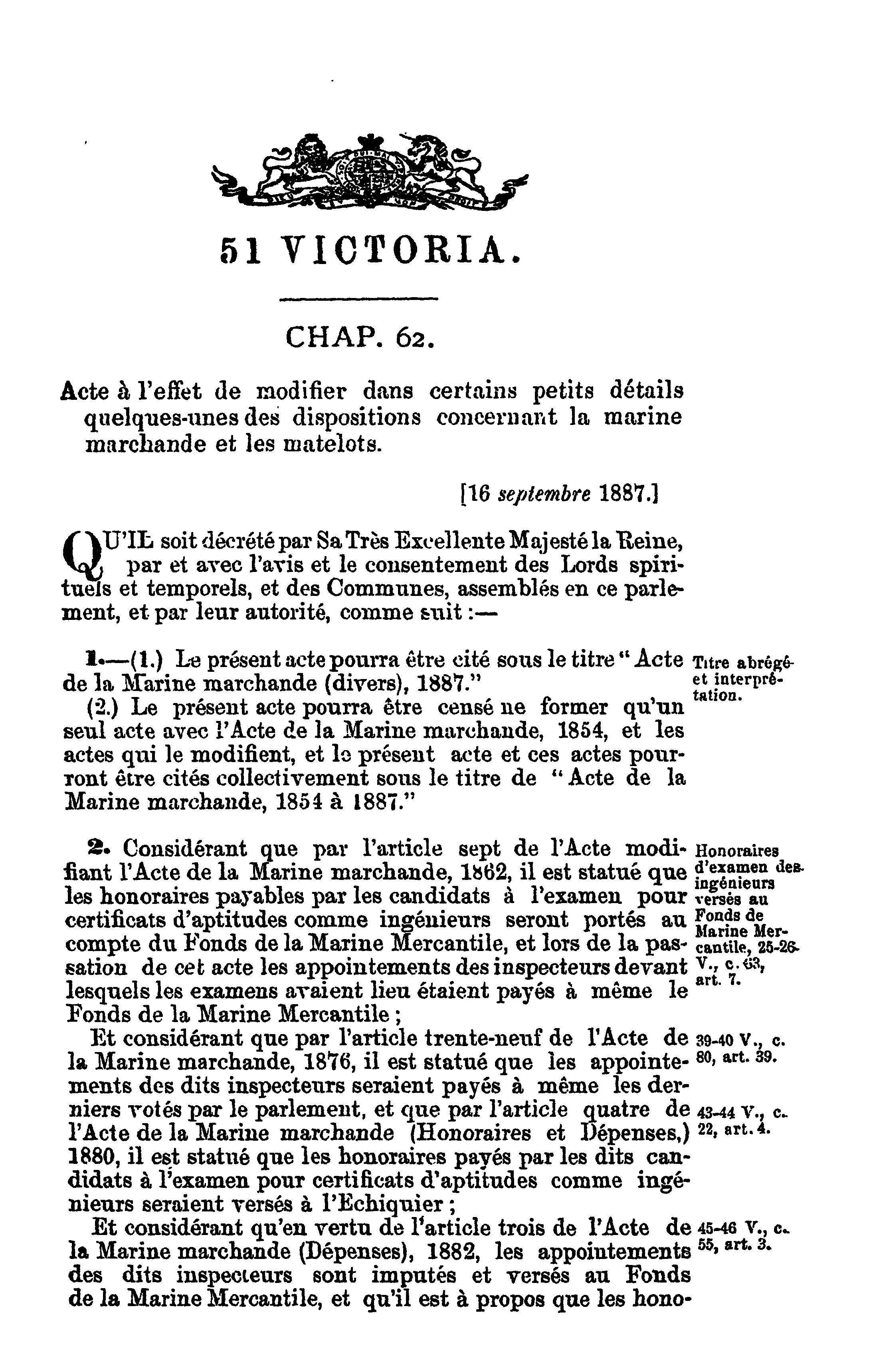 Actes du parlement de la puissance du Canada passés durant la session tenue en la cinquante et unième année du règne de Sa Majesté la Reine Victoria : étant la deuxième session du sixième parlement, commencée et tenue à Ottawa, le vingt-troisième jour de février, et fermée par prorogation le vingt-deuxième jour de mai 1888 : actes publics généraux : 1888 (ptie 1) (Actes 1-47)