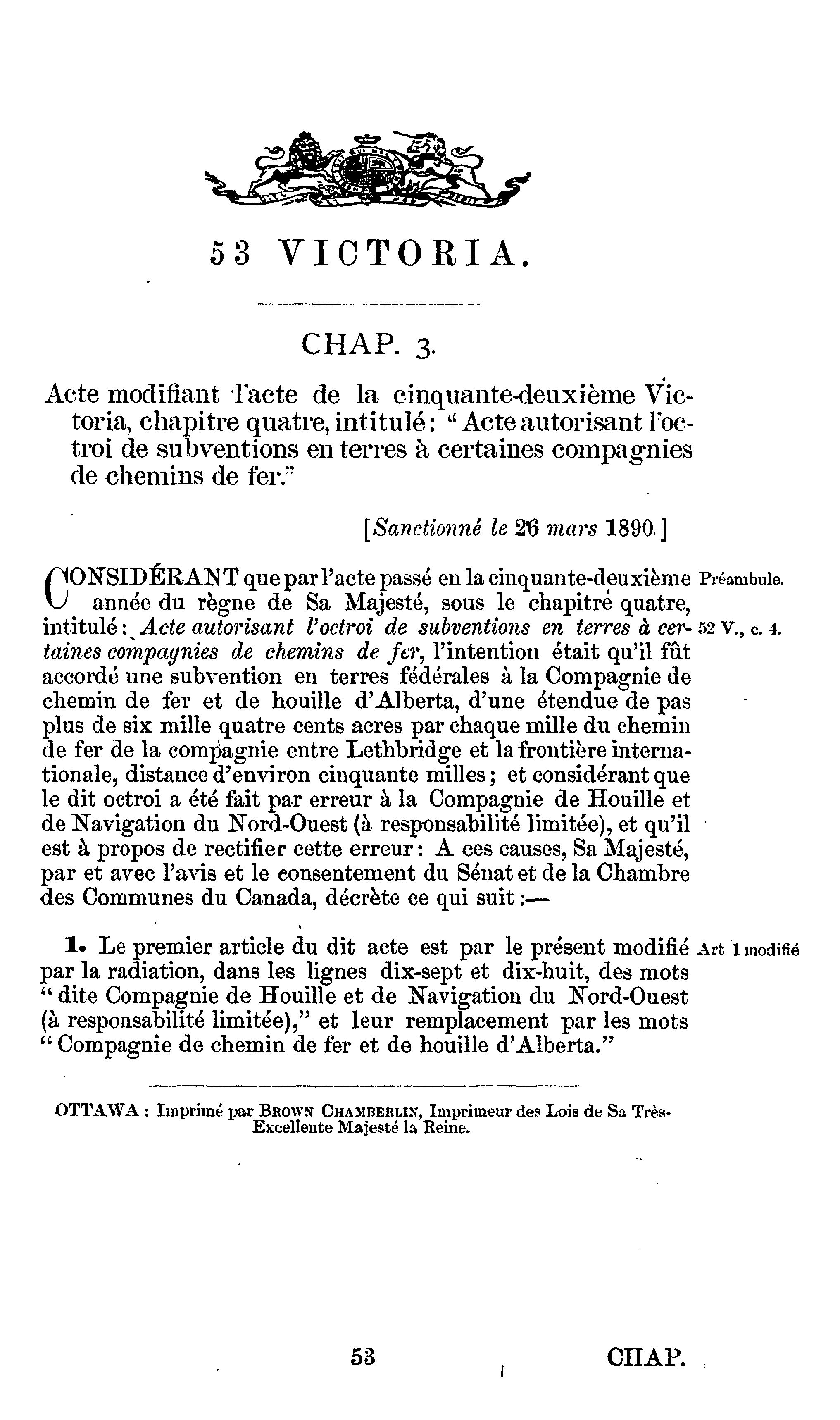 Actes du parlement de la puissance du Canada passés durant la session tenue en la cinquante-troisième année du règne de Sa Majesté la Reine Victoria : étant la quatrième session du sixième parlement, commencée et tenue à Ottawa le seizième jour de janvier, et fermée par prorogation le seizième jour de mai 1890 : actes publics généraux : 1890 (ptie 1) (Actes 1-38)