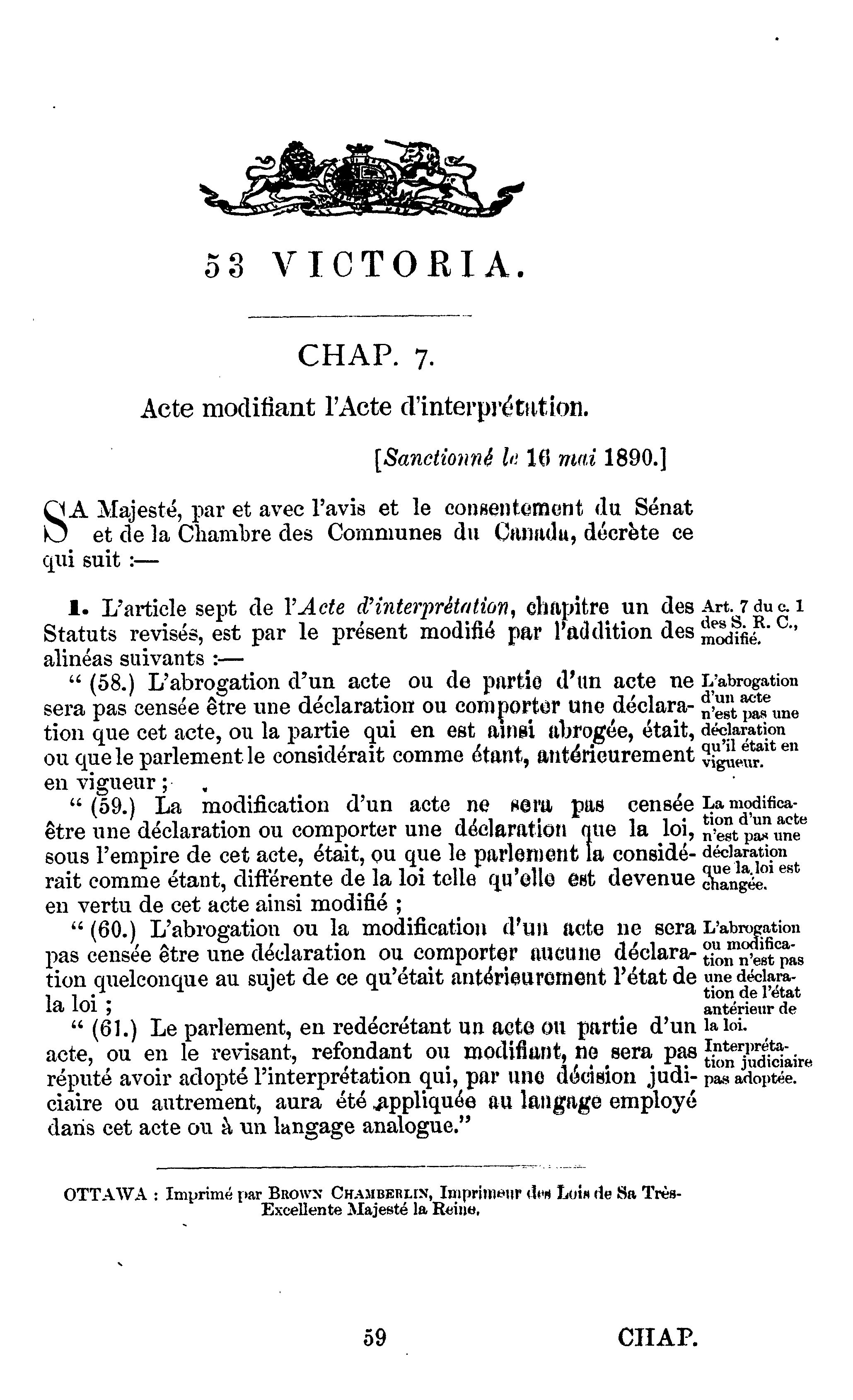Actes du parlement de la puissance du Canada passés durant la session tenue en la cinquante-troisième année du règne de Sa Majesté la Reine Victoria : étant la quatrième session du sixième parlement, commencée et tenue à Ottawa le seizième jour de janvier, et fermée par prorogation le seizième jour de mai 1890 : actes publics généraux : 1890 (ptie 1) (Actes 1-38)