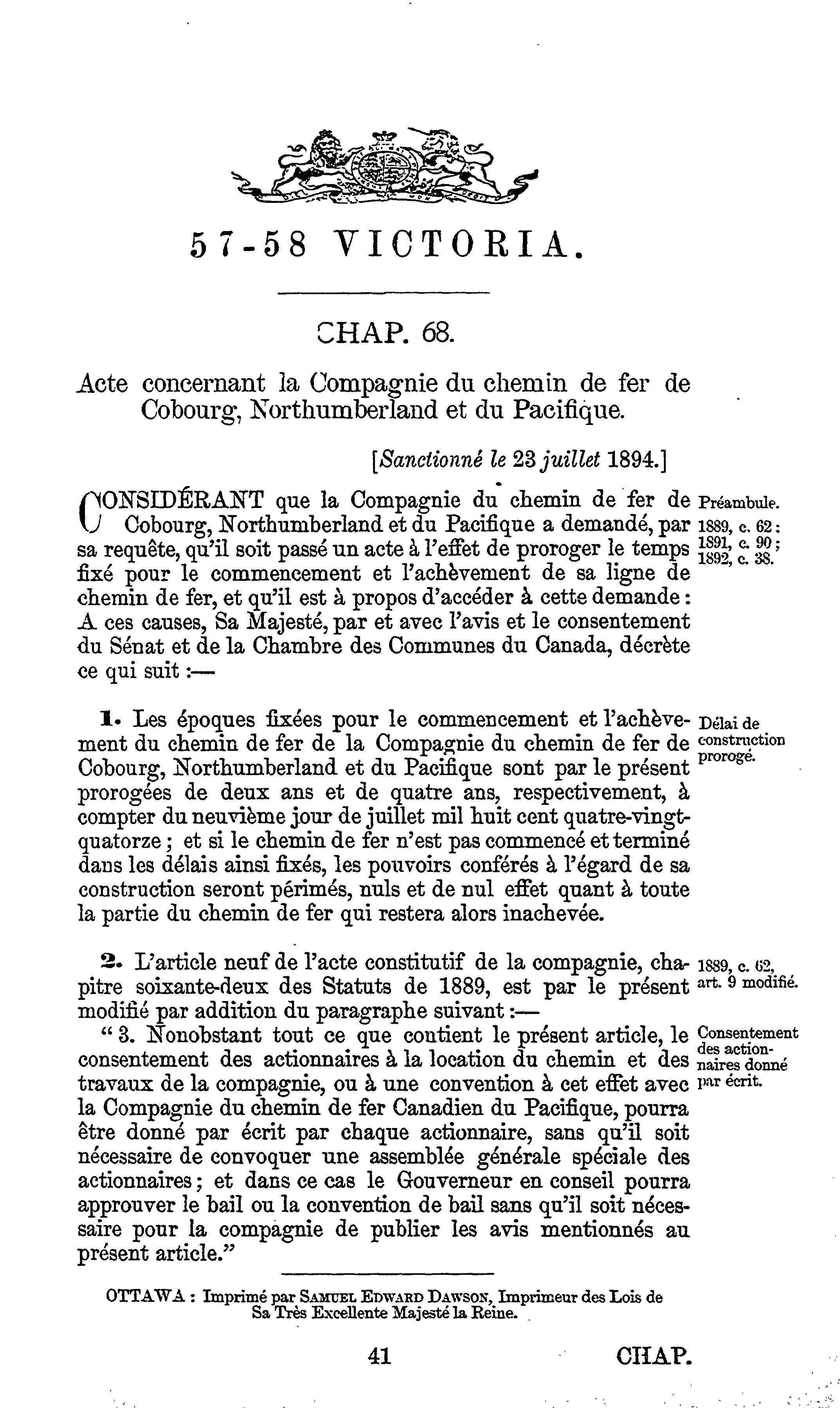 Actes du Parlement de la puissance du Canada : Actes du parlement de la puissance du Canada passés durant la session tenue en la cinquante-septième et cinquante-huitième années du règne de Sa Majesté la Reine Victoria : étant la quatrième session du septième parlement commencée et tenue à Ottawa, le quinzième jour de mars et fermée par prorogation le vingt-troisième jour de juillet 1894 : actes privés et locaux : 1894 (ptie 2) (Actes 61-134)