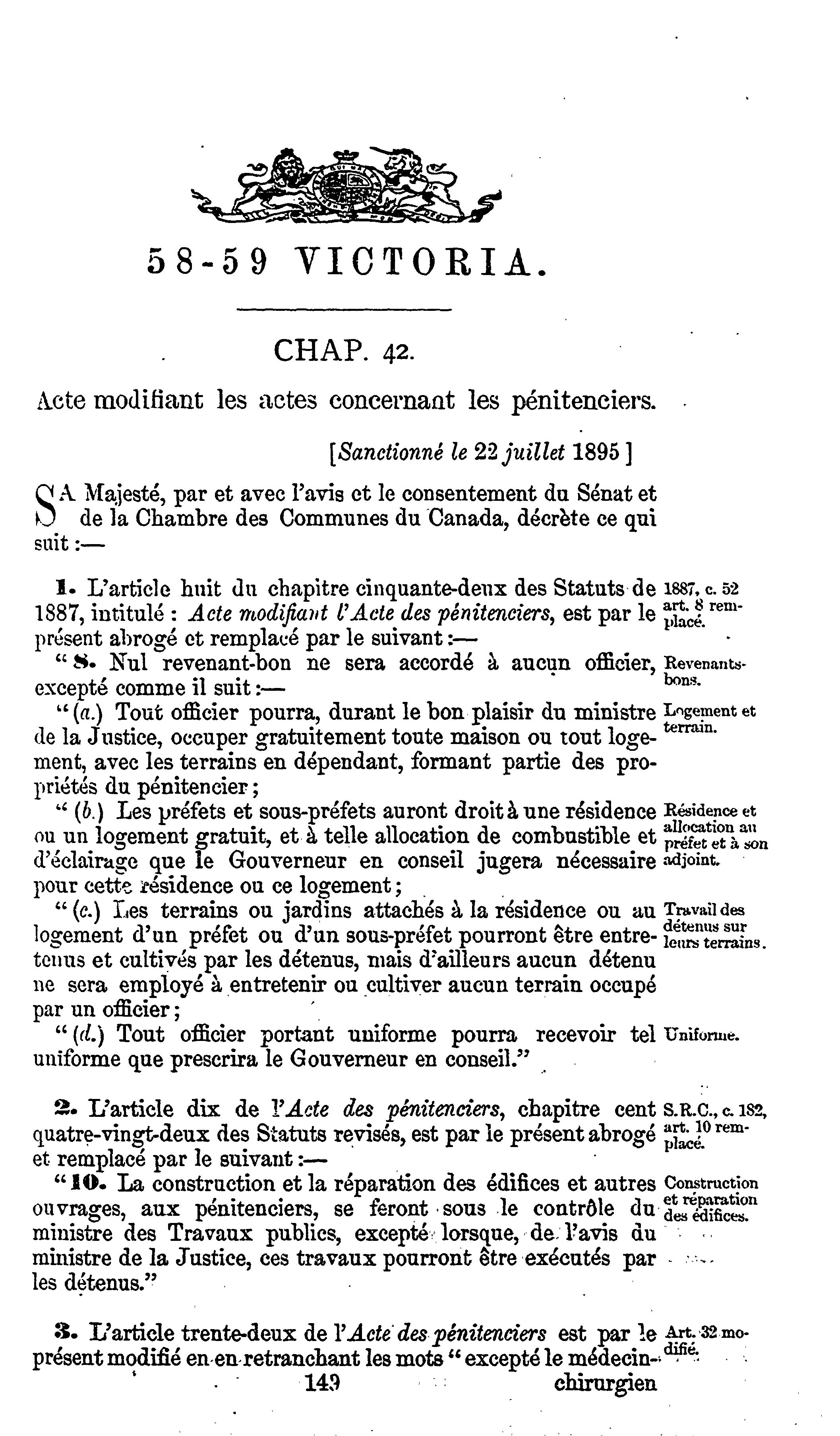 Actes du parlement de la puissance du Canada passés durant la session tenue en la cinquante-huitième et cinquante-neuvième années du règne de Sa Majesté la Reine Victoria : étant la cinquième session du septième parlement commencée et tenue à Ottawa, le dix-huitième jour d'avril et fermée par prorogation le vingt-deuxième jour de juillet 1895 : actes publics généraux : 1895 (ptie 1) (Actes 1-44)