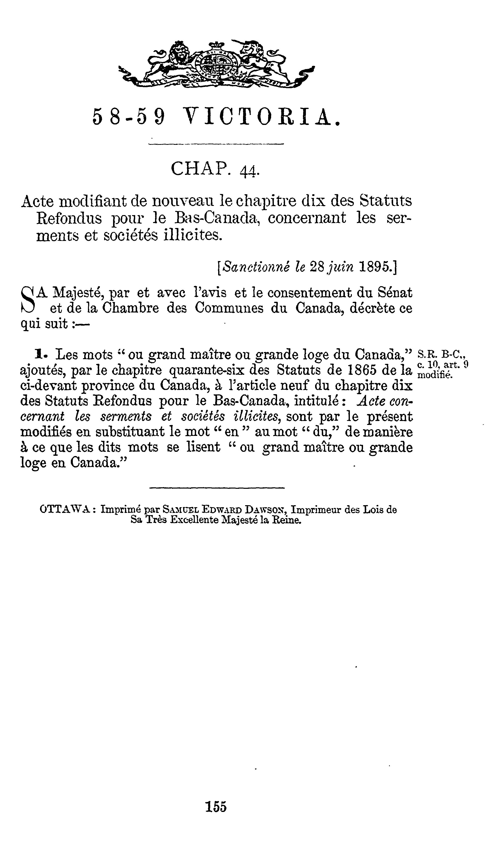 Actes du parlement de la puissance du Canada passés durant la session tenue en la cinquante-huitième et cinquante-neuvième années du règne de Sa Majesté la Reine Victoria : étant la cinquième session du septième parlement commencée et tenue à Ottawa, le dix-huitième jour d'avril et fermée par prorogation le vingt-deuxième jour de juillet 1895 : actes publics généraux : 1895 (ptie 1) (Actes 1-44)
