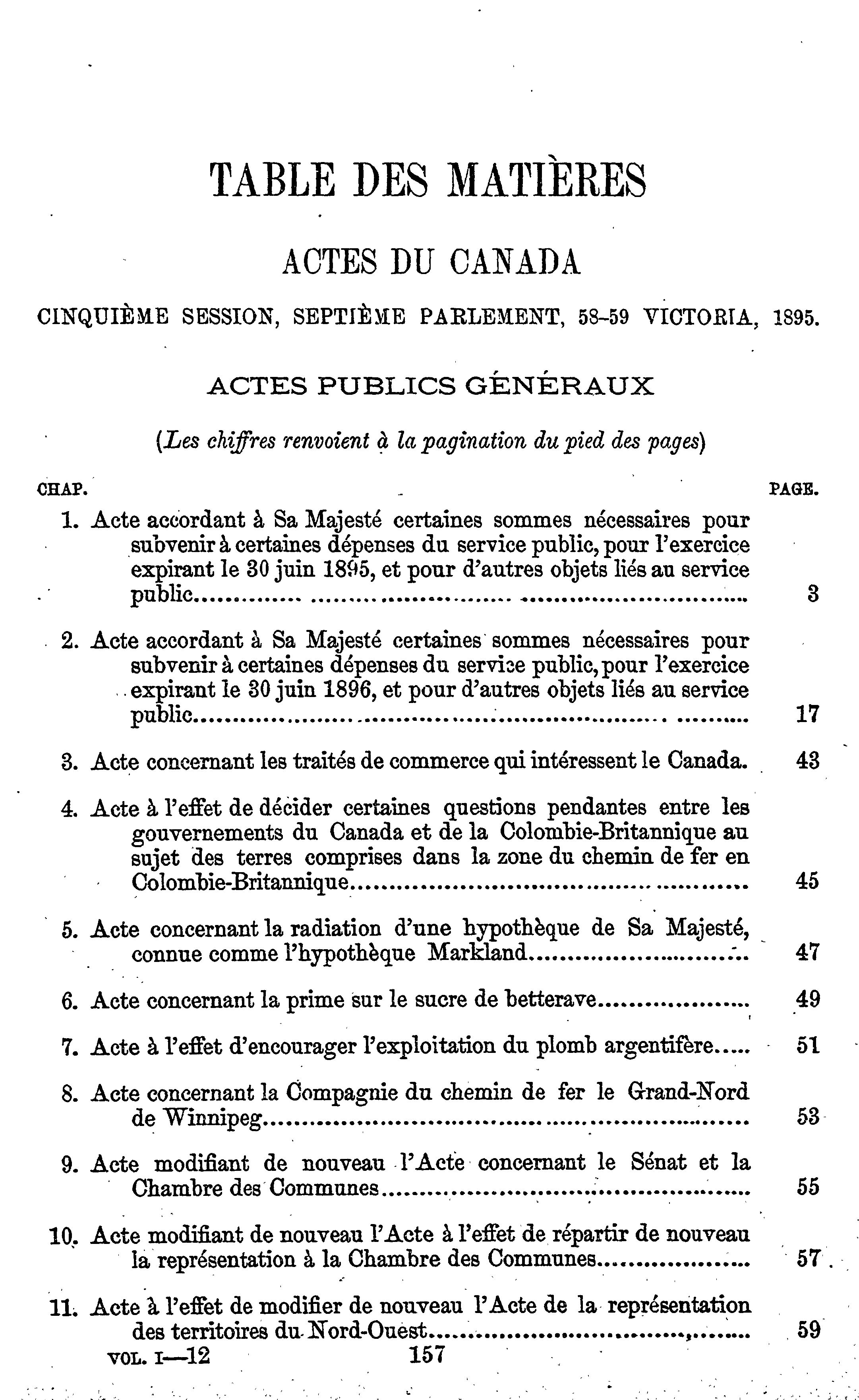 Actes du parlement de la puissance du Canada passés durant la session tenue en la cinquante-huitième et cinquante-neuvième années du règne de Sa Majesté la Reine Victoria : étant la cinquième session du septième parlement commencée et tenue à Ottawa, le dix-huitième jour d'avril et fermée par prorogation le vingt-deuxième jour de juillet 1895 : actes publics généraux : 1895 (ptie 1) (Actes 1-44)