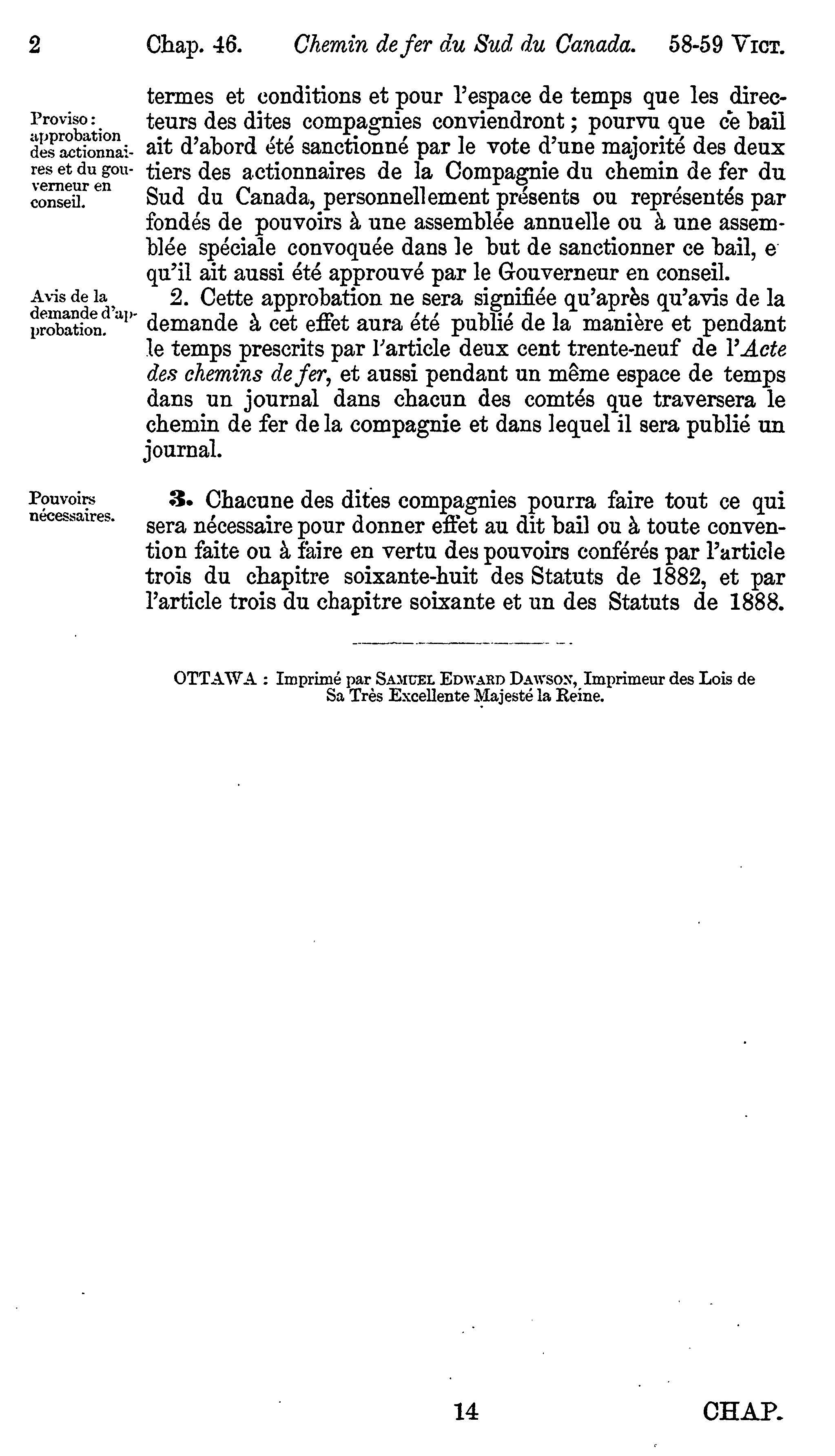 Actes du Parlement de la puissance du Canada : Actes du parlement de la puissance du Canada passés durant la session tenue en la cinquante-huitième et cinquante-neuvième années du règne de Sa Majesté la Reine Victoria : étant la cinquième session du septième parlement commencée et tenue à Ottawa, le dix-huitième jour d'avril et fermée par prorogation le vingt-deuxième jour de juillet 1895 : actes privés et locaux : 1895 (ptie 2) (Actes 45-97)