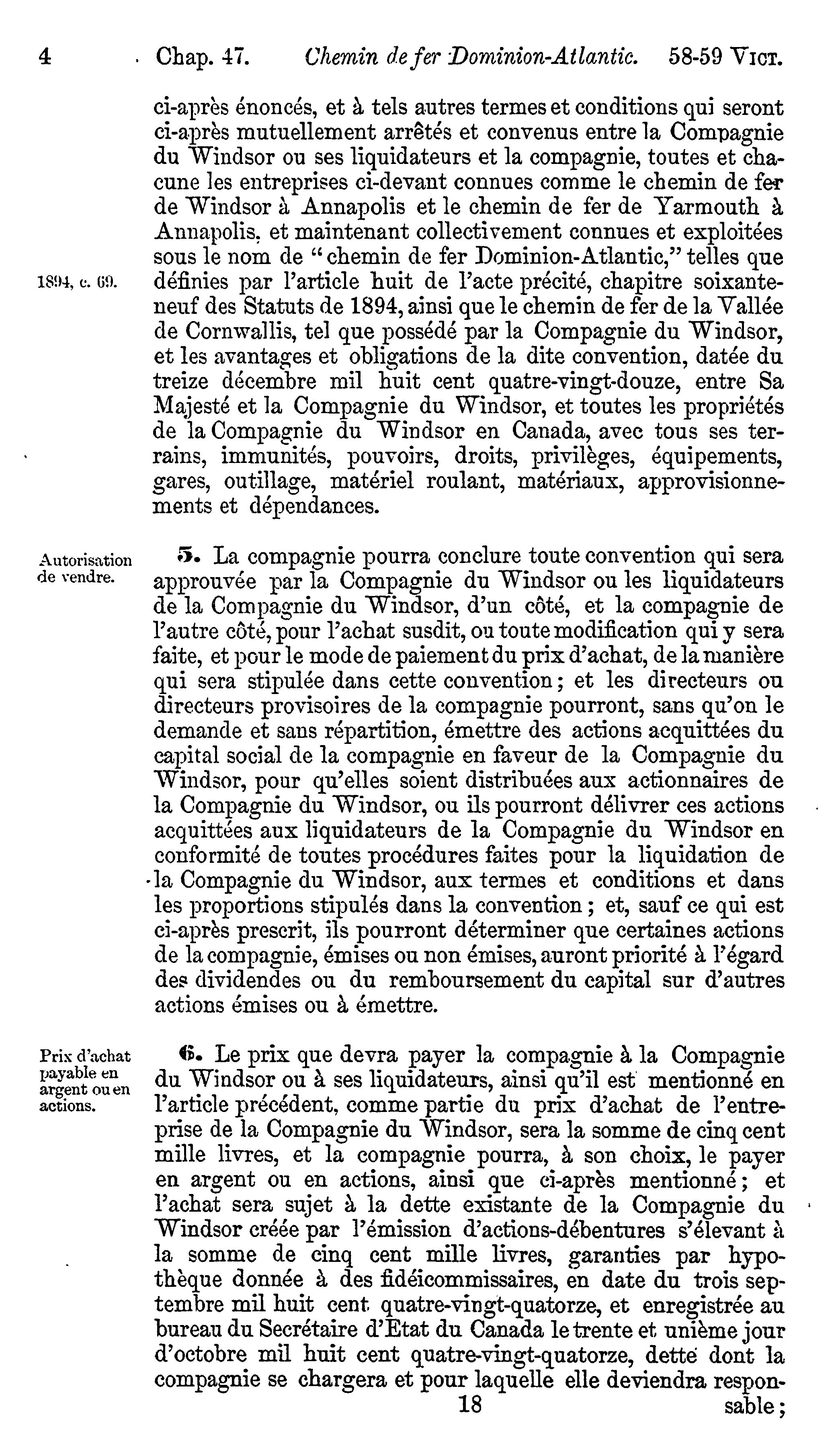 Actes du parlement de la puissance du Canada passés durant la session tenue en la cinquante-huitième et cinquante-neuvième années du règne de Sa Majesté la Reine Victoria : étant la cinquième session du septième parlement commencée et tenue à Ottawa, le dix-huitième jour d'avril et fermée par prorogation le vingt-deuxième jour de juillet 1895 : actes privés et locaux : 1895 (ptie 2) (Actes 45-97)