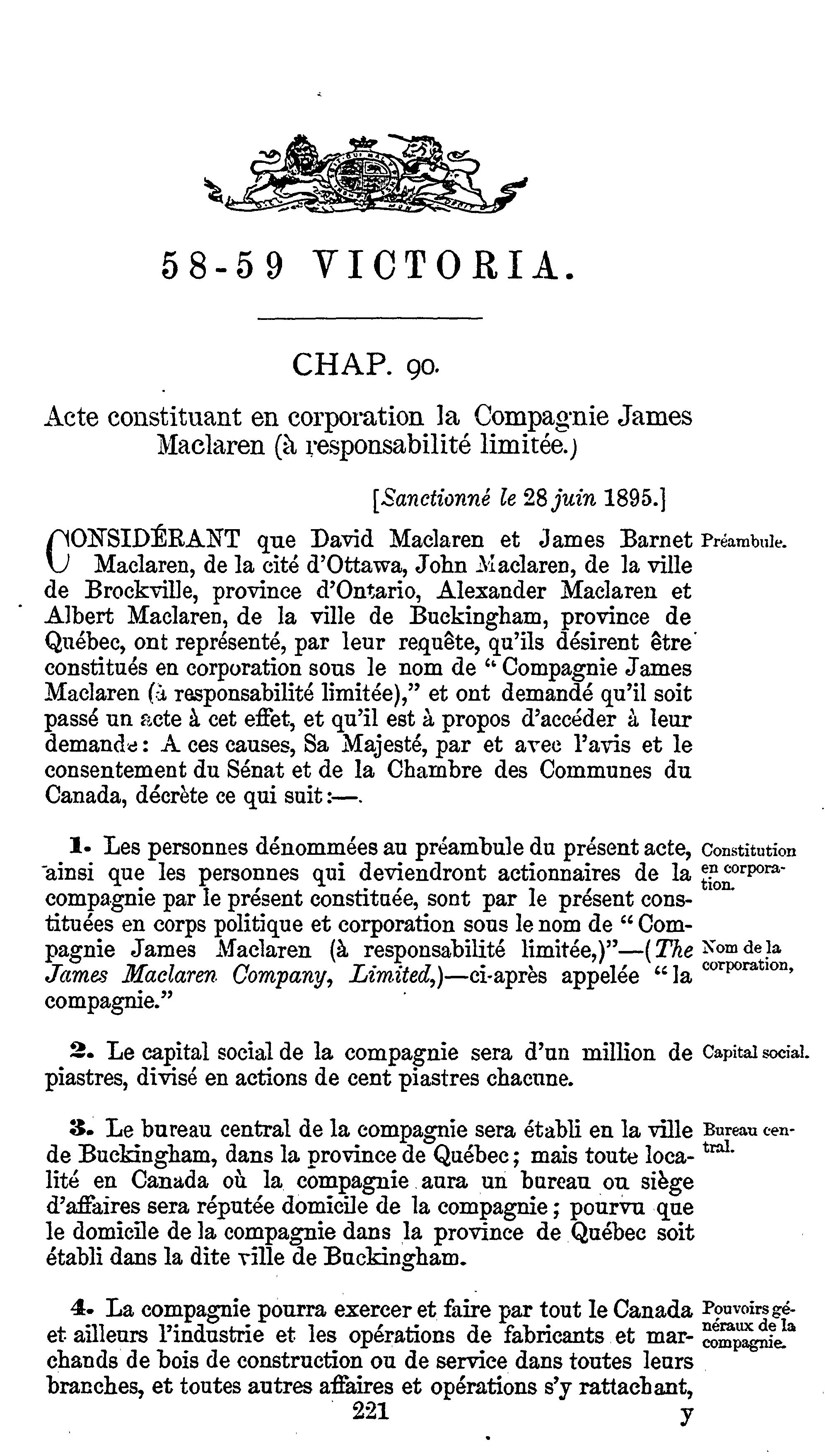 Actes du parlement de la puissance du Canada passés durant la session tenue en la cinquante-huitième et cinquante-neuvième années du règne de Sa Majesté la Reine Victoria : étant la cinquième session du septième parlement commencée et tenue à Ottawa, le dix-huitième jour d'avril et fermée par prorogation le vingt-deuxième jour de juillet 1895 : actes privés et locaux : 1895 (ptie 2) (Actes 45-97)