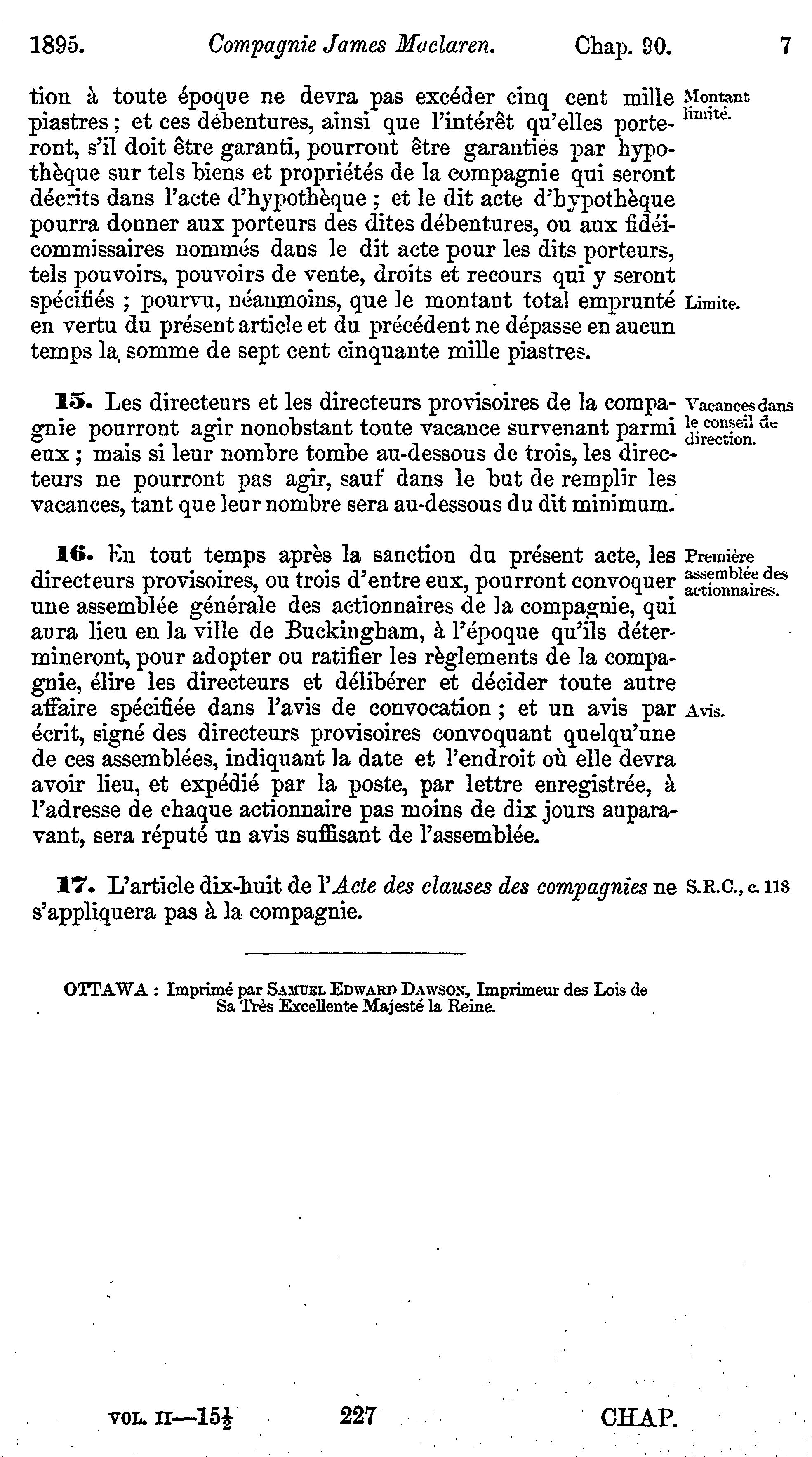 Actes du Parlement de la puissance du Canada : Actes du parlement de la puissance du Canada passés durant la session tenue en la cinquante-huitième et cinquante-neuvième années du règne de Sa Majesté la Reine Victoria : étant la cinquième session du septième parlement commencée et tenue à Ottawa, le dix-huitième jour d'avril et fermée par prorogation le vingt-deuxième jour de juillet 1895 : actes privés et locaux : 1895 (ptie 2) (Actes 45-97)