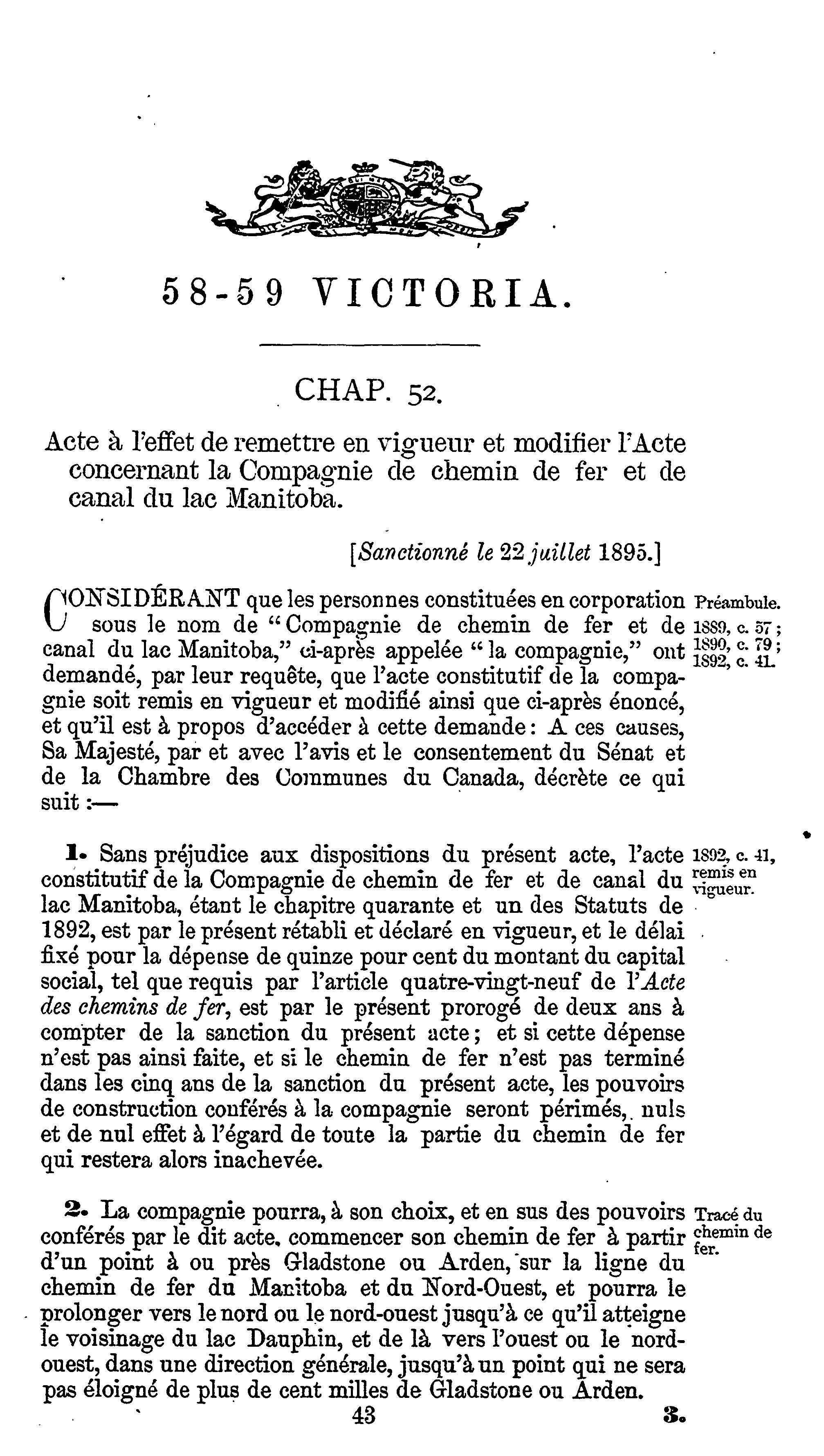 Actes du Parlement de la puissance du Canada : Actes du parlement de la puissance du Canada passés durant la session tenue en la cinquante-huitième et cinquante-neuvième années du règne de Sa Majesté la Reine Victoria : étant la cinquième session du septième parlement commencée et tenue à Ottawa, le dix-huitième jour d'avril et fermée par prorogation le vingt-deuxième jour de juillet 1895 : actes privés et locaux : 1895 (ptie 2) (Actes 45-97)