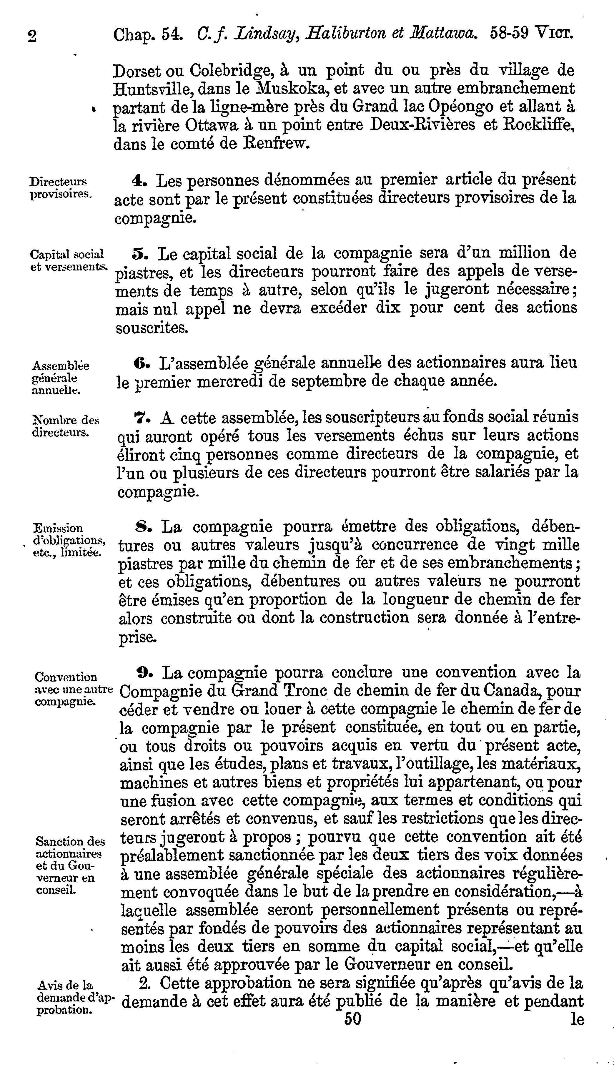 Actes du parlement de la puissance du Canada passés durant la session tenue en la cinquante-huitième et cinquante-neuvième années du règne de Sa Majesté la Reine Victoria : étant la cinquième session du septième parlement commencée et tenue à Ottawa, le dix-huitième jour d'avril et fermée par prorogation le vingt-deuxième jour de juillet 1895 : actes privés et locaux : 1895 (ptie 2) (Actes 45-97)