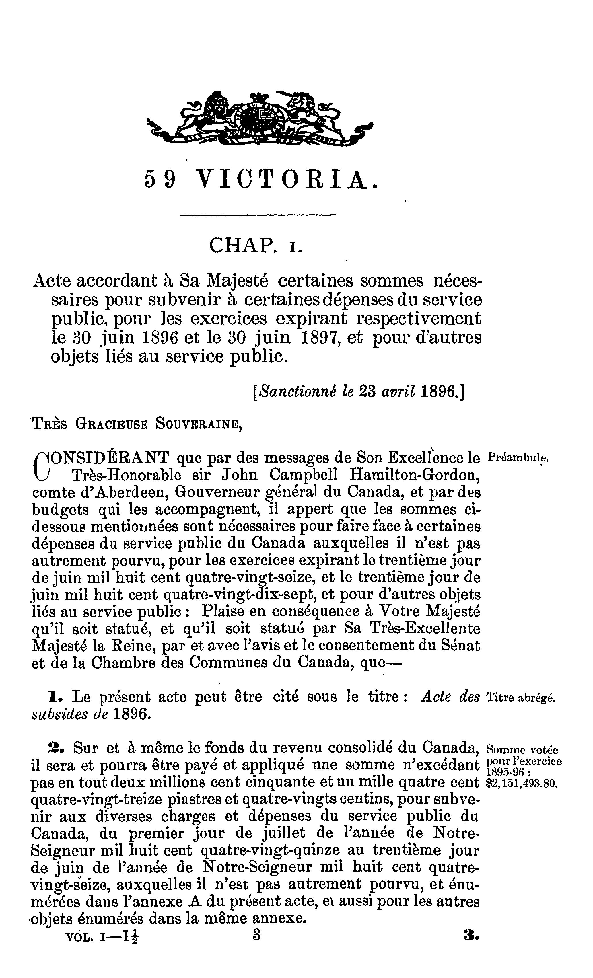 Actes du parlement de la puissance du Canada passés durant la session tenue en la cinquante-neuvième année du règne de Sa Majesté la Reine Victoria : étant la sixième session du septième parlement commencée et tenue à Ottawa, le deuxième jour de janvier et fermée par prorogation le vingt-troisième jour d'avril 1896 : actes publics généraux : 1896 (ptie 1) (Actes 1-14)