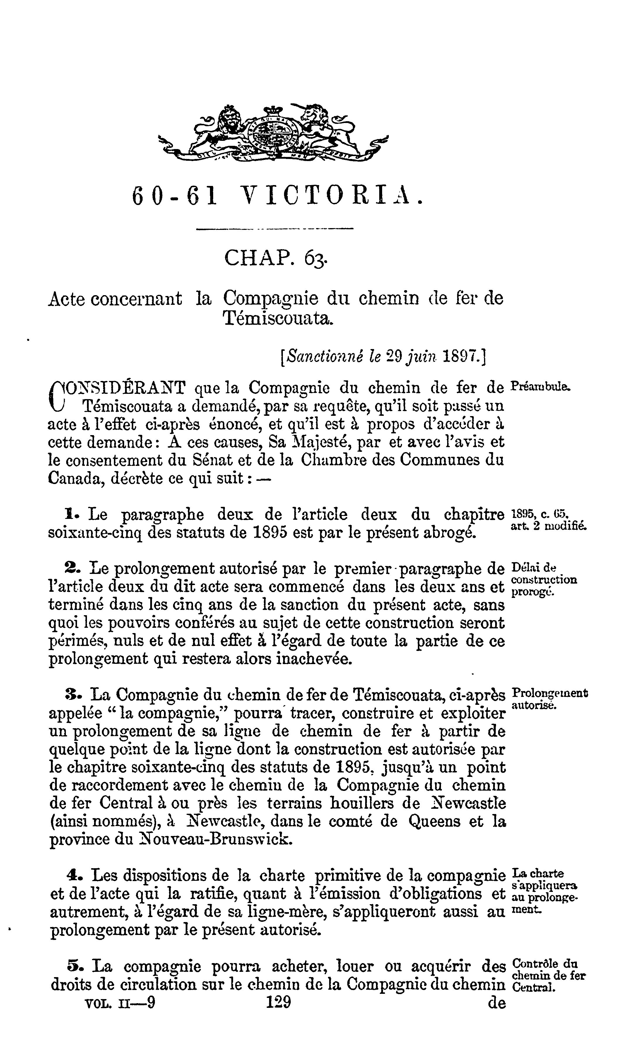 Actes du parlement de la puissance du Canada passés durant la session tenue en les soixantième et soixante-unième années du règne de Sa Majesté la Reine Victoria : étant la deuxième session du huitième parlement commencée et tenue à Ottawa, le vingt-cinquième jour de mars, et fermée par prorogation le vingt-neuvième jour de juin 1897 : actes privés et locaux : 1897 (ptie 2) (Actes 35-97)