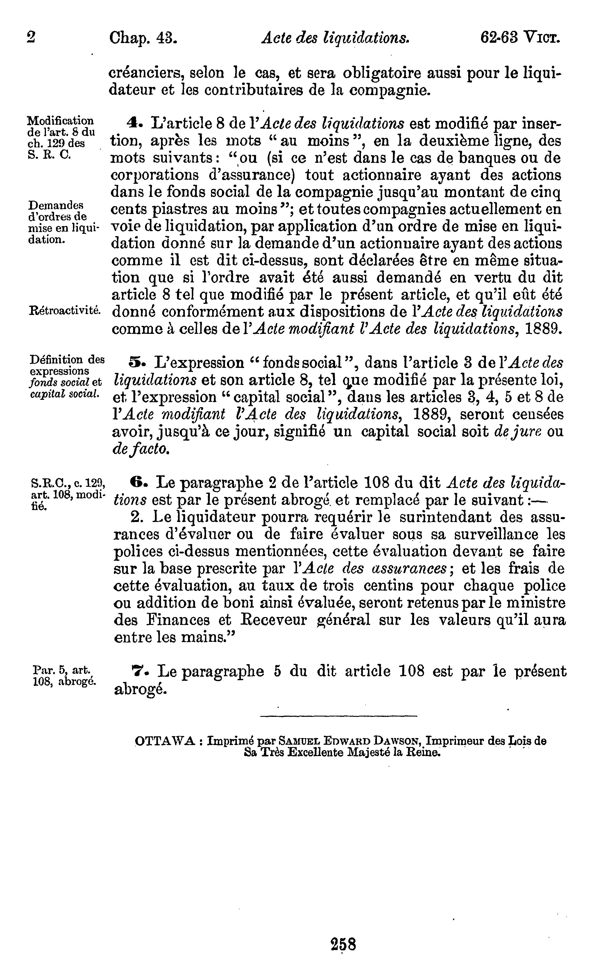 Actes du parlement de la puissance du Canada passés durant la session tenue en les soixante-deuxième et soixante-troisième années du règne de Sa Majesté la Reine Victoria : étant la quatrième session du huitième parlement, commencée et tenue à Ottawa, le seizième jour de mars, et fermée par prorogation le onzième jour d'août 1899 : actes publics généraux : 1899 (ptie 1) (Actes 1-49)